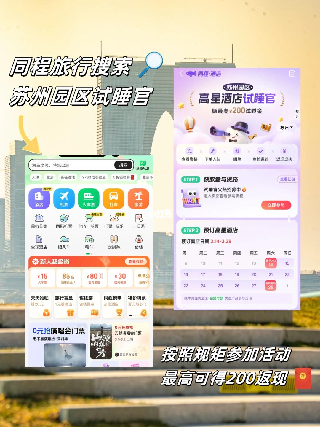 ▪在同程旅行APP或者小程序端搜🔍“苏州园区试睡官”,可以赢取高星酒店的试睡返现奖励