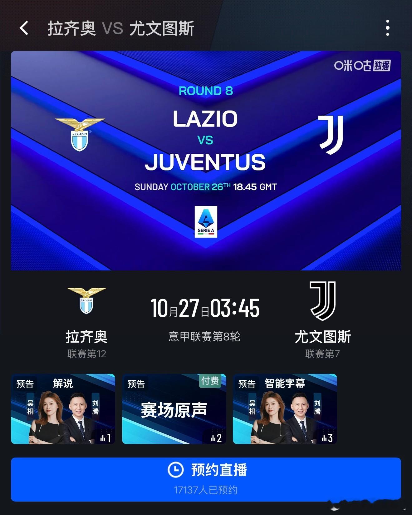 周日27:15拉齐奥vs尤文图斯 搭档刘腾