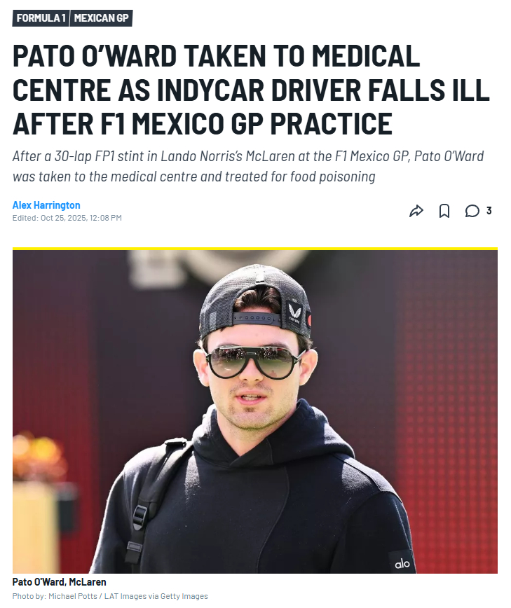 墨西哥车手帕托·欧沃德驾驶兰多·诺里斯的赛车完成了F1墨西哥城大奖赛一练之后,因食物中毒被送往医疗中心接受治疗[允悲]