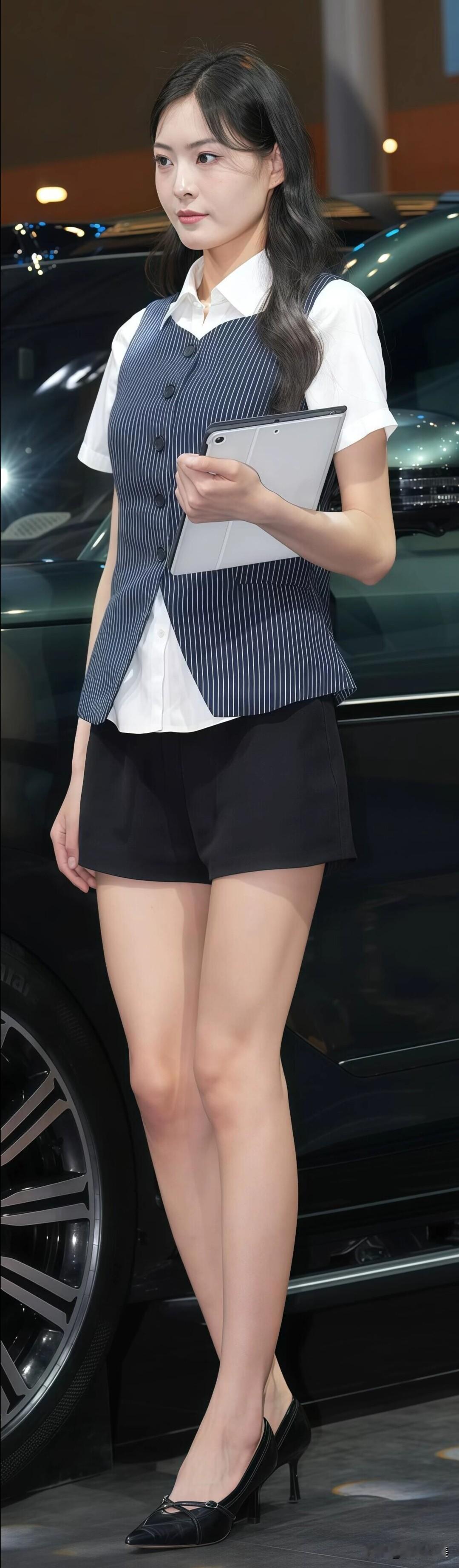 车展里,她身着条纹马甲搭配白衬衫,手持平板,干练又专业,成为展会上一道亮眼的风景。