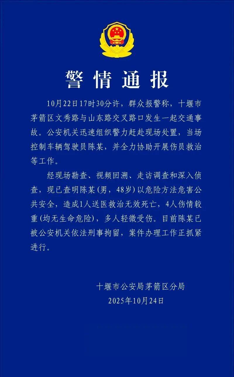 湖北十堰“平安茅箭”微信公众号10月25日凌晨消息,十堰市公安局茅箭区分局10月24日发布警情通报:10月22日17时30分许,群众报警称,十堰市茅箭区文秀路与山东路交叉路口发生一起交通事故。公安机关迅速组织警力赶赴现场处置,当场控制车辆驾驶员陈某,并全力协助开展伤员救治等工作。经现场勘查、视频回溯、走访调查和深入侦查,现已查明陈某(男,48岁)以危险方法危害公共安全,造成1人送医救治无效死亡,4人伤情较重(均无生命危险),多人轻微受伤。目前陈某已被公安机关依法刑事拘留,案件办理工作正抓紧进行。