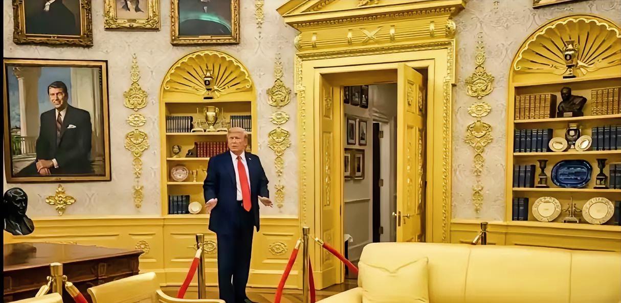 58美元的黄金墙,照出了白宫的塑料灵魂 想象一下,外媒镜头扫过椭圆形办公室,一片金光闪到观众眯眼,结果镜头拉近——墙饰标签写着“Home Depot 58.99, clearance”。没错,特朗普把白宫升级成“黄金宫殿”,材料却是超市货架上的聚氨酯,轻得能当飞盘。 我隔着屏幕都听到“咔哒”一声,那是幻想碎裂的音效。当年在特朗普大厦电梯里被镀金镜子包围的地产商,如今把同一套“亮瞎我”的配方搬进宾夕法尼亚大道1600号,像给林肯的画像加了一层抖音滤镜。 美国网友当然不会放过这场狂欢:有人P图把自由女神也刷成土豪金,配文“make her great again”;有人吐槽“白宫不是赌城套房”。我却突然理解了他——对商人来说,金色=值钱,塑料便宜,便宜又值钱,就是终极浪漫。 只是,当历史书翻到这一页,读者会发现:最权力顶端的办公室,用最轻飘的材料包装辉煌。镀金可以刮掉,塑料会老化,风格却永远留在影像里。 那么问题来了:如果给你58美元,你会把这片“塑料黄金”贴在自己客厅墙上,还是宁愿留着空白让时间自己上色?留言告诉我,你敢不敢把“土豪金”带回家?