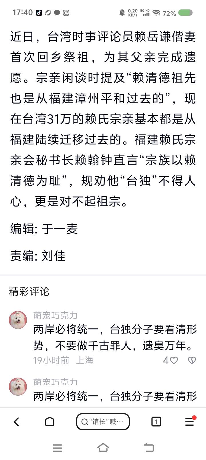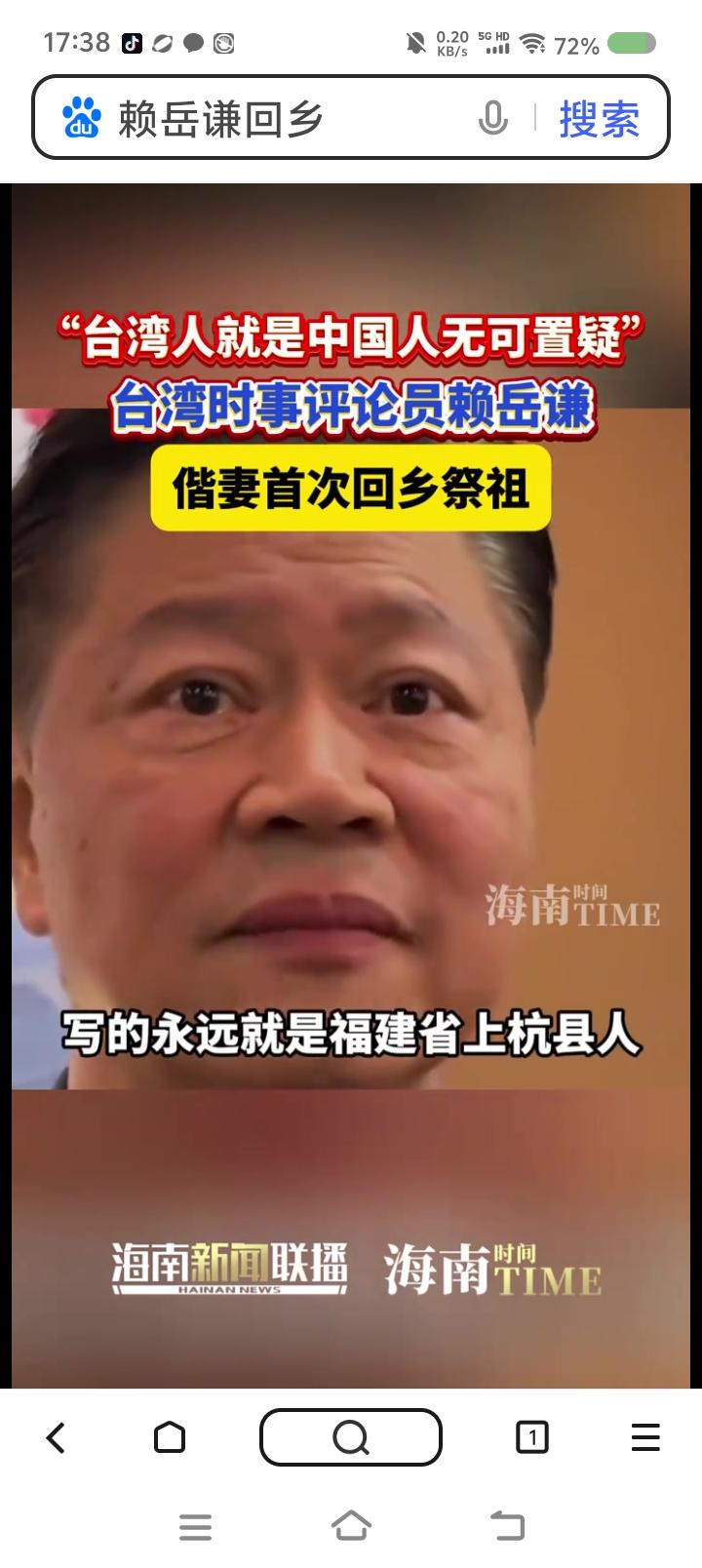 网红“馆长”要帮赖清德寻根?—— 据报道,近日,台湾网红“馆长”将赴大陆,参加台湾光复80周年纪念活动。同时,还要去地方访问,包括帮赖清德寻根,“他要欺师灭祖吗?他知道他祖先是谁吗?” 点评: 据报道,前几天,赖岳谦夫妇回大陆祭祖。宗亲谈及赖清德祖上是从福建潭州平和县一带迁过去的。 赖清德还有根吗? 蔡英文还有根吗?