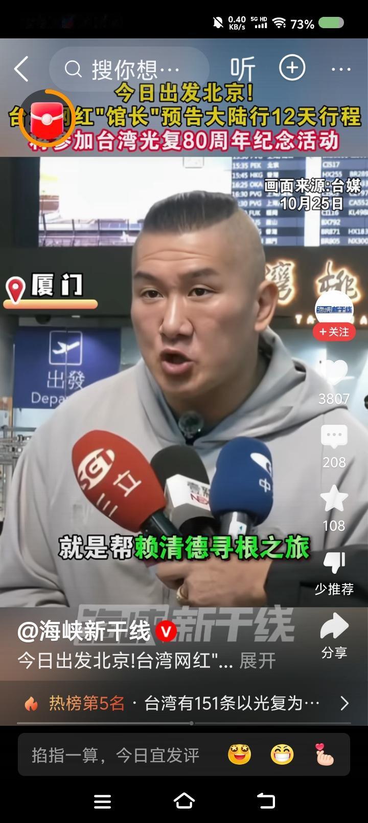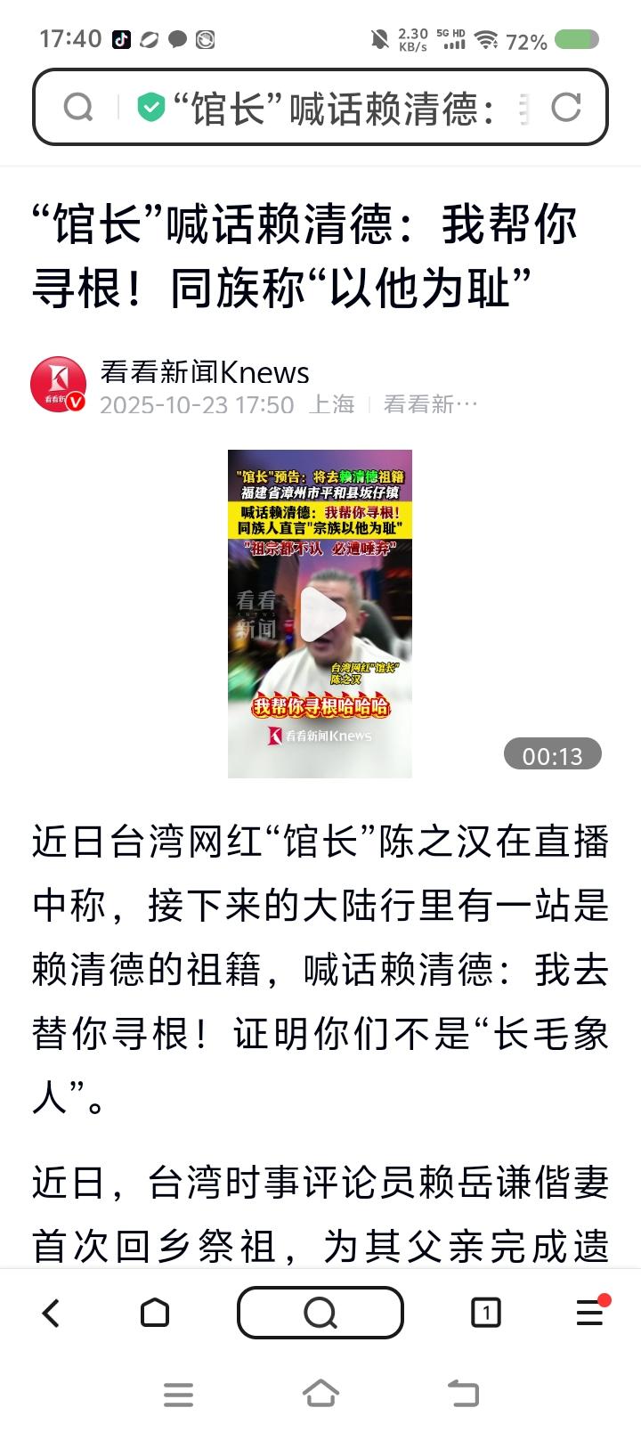 网红“馆长”要帮赖清德寻根?—— 据报道,近日,台湾网红“馆长”将赴大陆,参加台