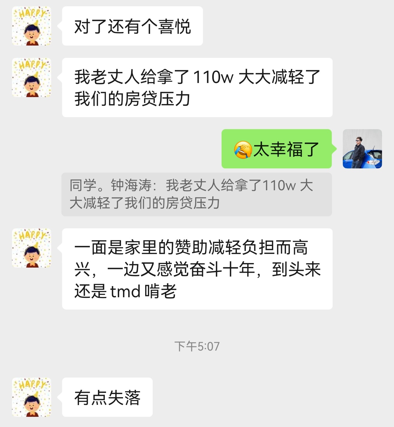 三十多岁了,要有退路才行,今天大学最好的兄弟说老丈人给他 110 万还房贷,就是没有任何缘由的情况下给了他 110 万(图 3),很羡慕他,但他也要工作,也有压力,也时常有一些天马行空的想法和所谓梦想。