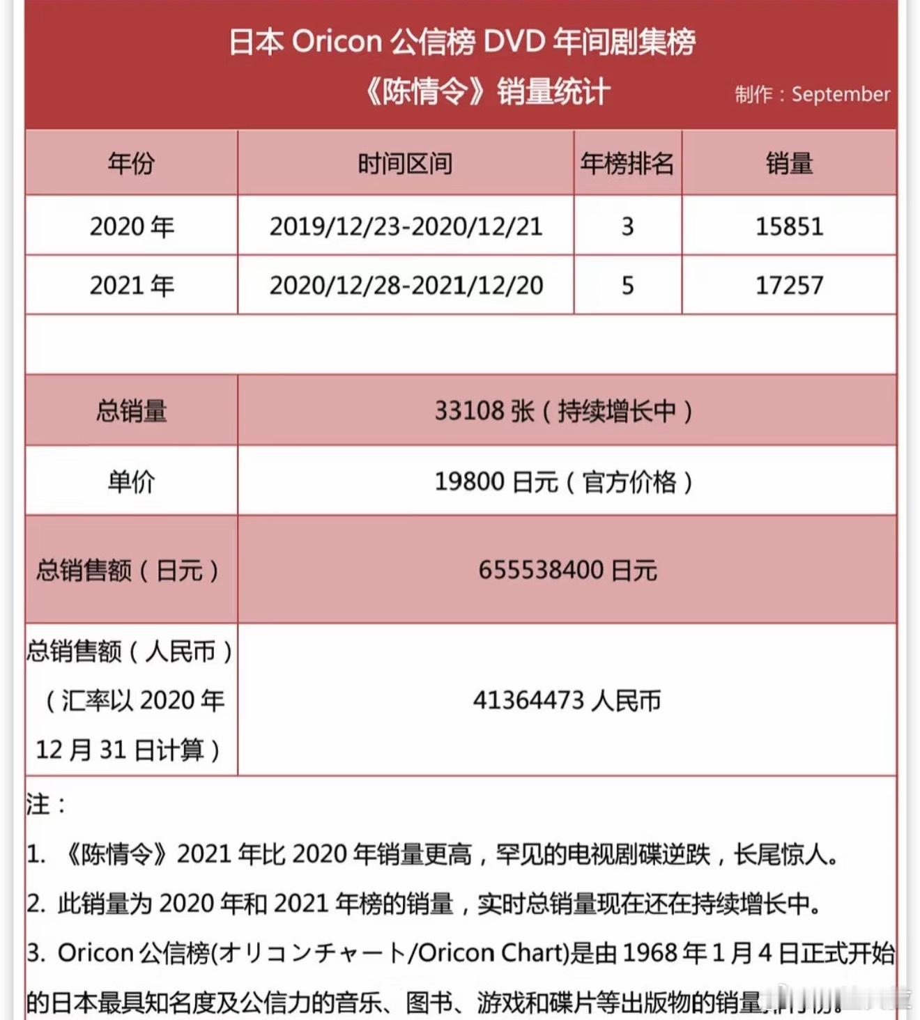 O榜应该是日本最权威的销量榜,当年电视剧dvd榜单都是本土热剧,陈情令20年和21年在海外单单日本一个国家就卖了4000万rmb,现在累计应该更多了。真的算国剧之光了