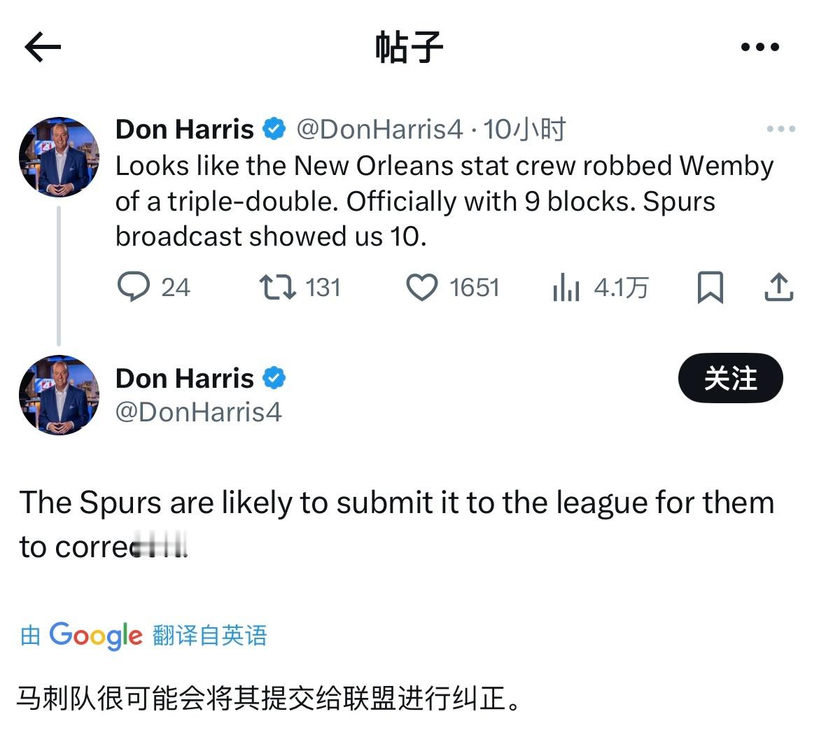 “技术台统计文班亚马盖帽数据是9个,但是马刺队的转播显示是10个,马刺很可能会向联盟申请修正。”