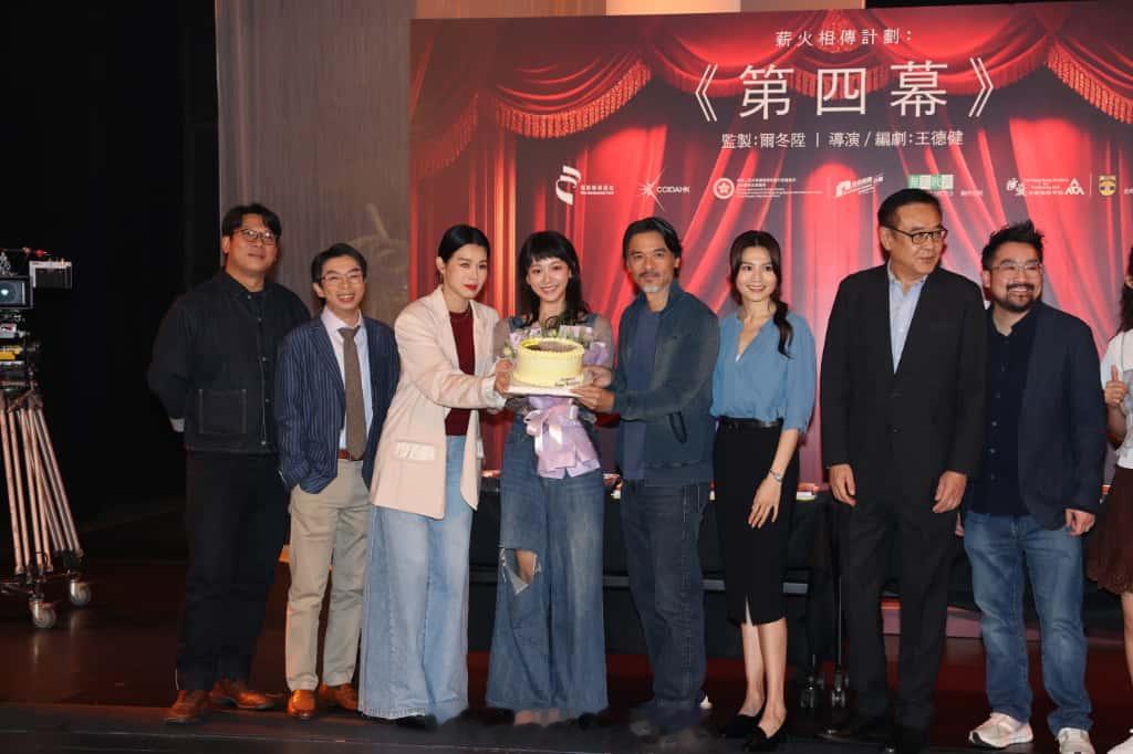 胡杏儿与今天(25日)生日的袁澧林、冯德伦、周秀娜、杨伟伦现身演艺学院电影《第四幕》开镜拜神仪式。大会即场送上生日蛋糕及鲜花为袁澧林庆祝。