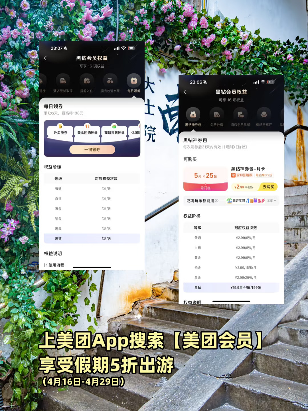 而且现在4月16日-4月29日,上美团App搜索【美团会员】享受假期5折出游,