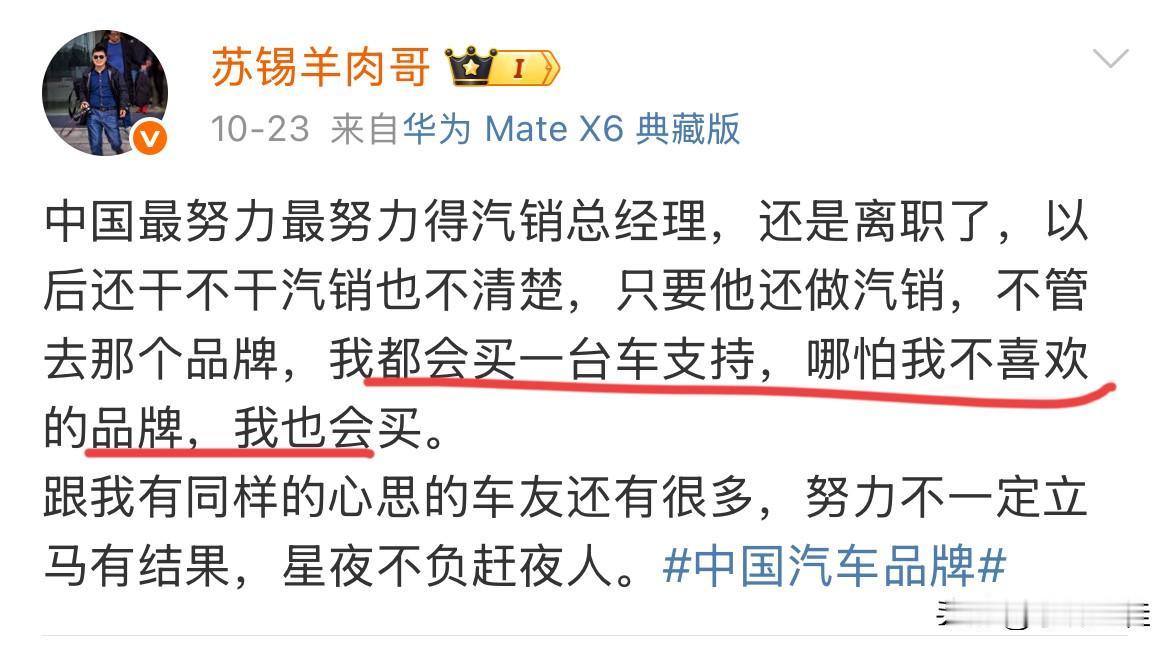 来自比亚迪唐、元、腾势、仰望U8车主羊肉哥的分享:“中国最努力的汽销总经理,还是离职了,以后只要他还做汽销,不管是哪个品牌,都会买一辆车支持,哪怕是自己不喜欢的品牌!跟我同样心思的车友还有很多!” 看得出来,虽然被很多人骂没有能力,但车主是真的认可赵长江!这真的是卖一辆车,交一个朋友了!赵长江离职比亚迪后,比亚迪就剩一群“老登”了!就一个有点想法的人,就这么辞职了! 再说一遍,腾势的问题不是赵长江一个人造成的,而且他的问题几乎可以忽略,腾势的问题来自整个团队以及最后拍板的人,就那丑不拉几的设计,我都怀疑设计师是友商派来的“卧底”!