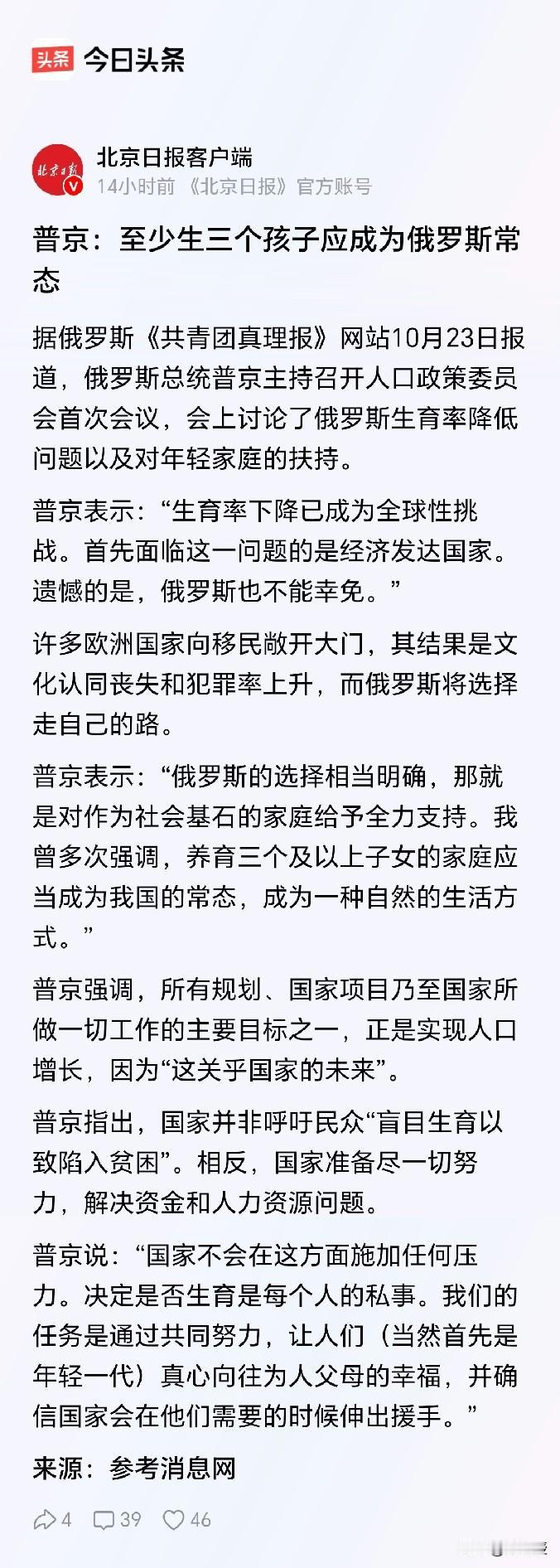 普京总统: 至少生三个孩子,应该成为俄罗斯常态 您怎么看?