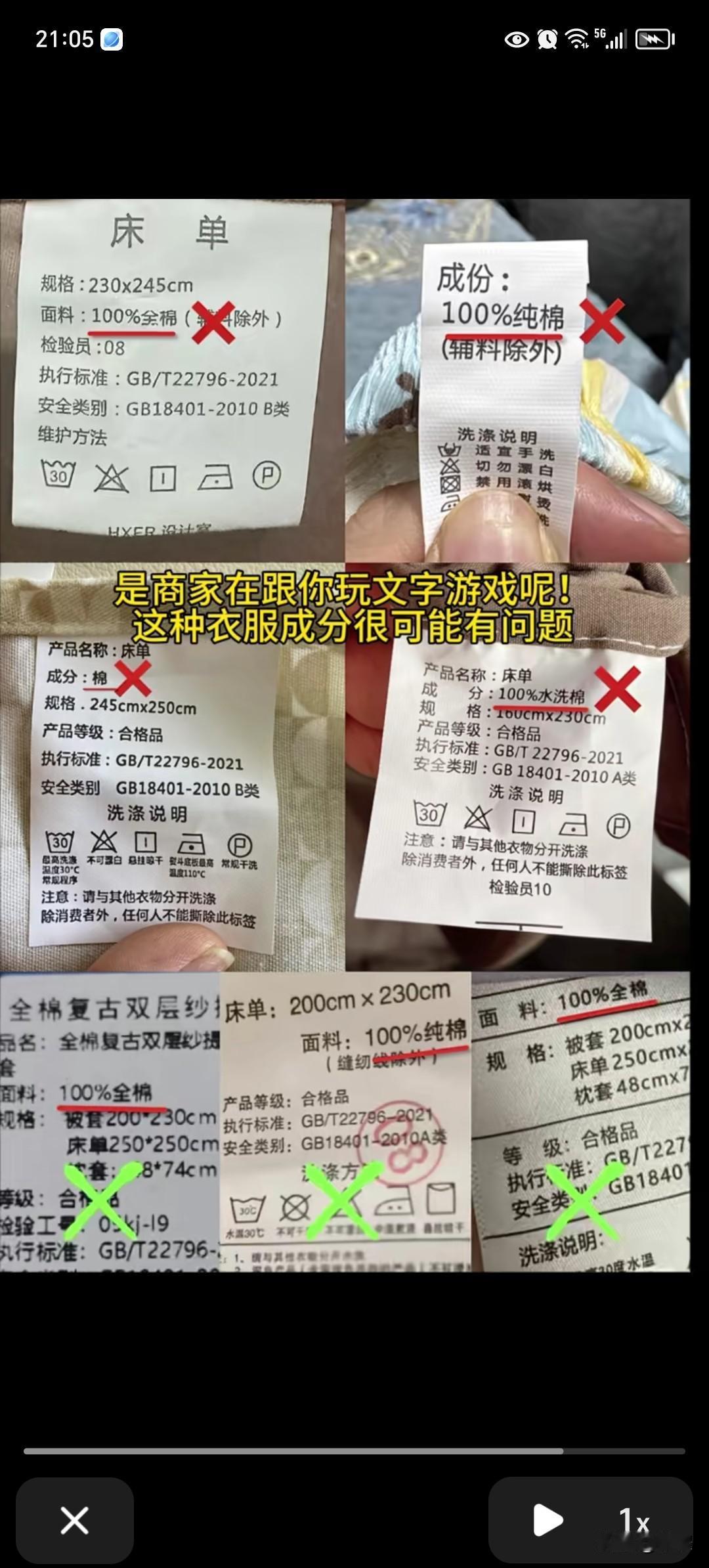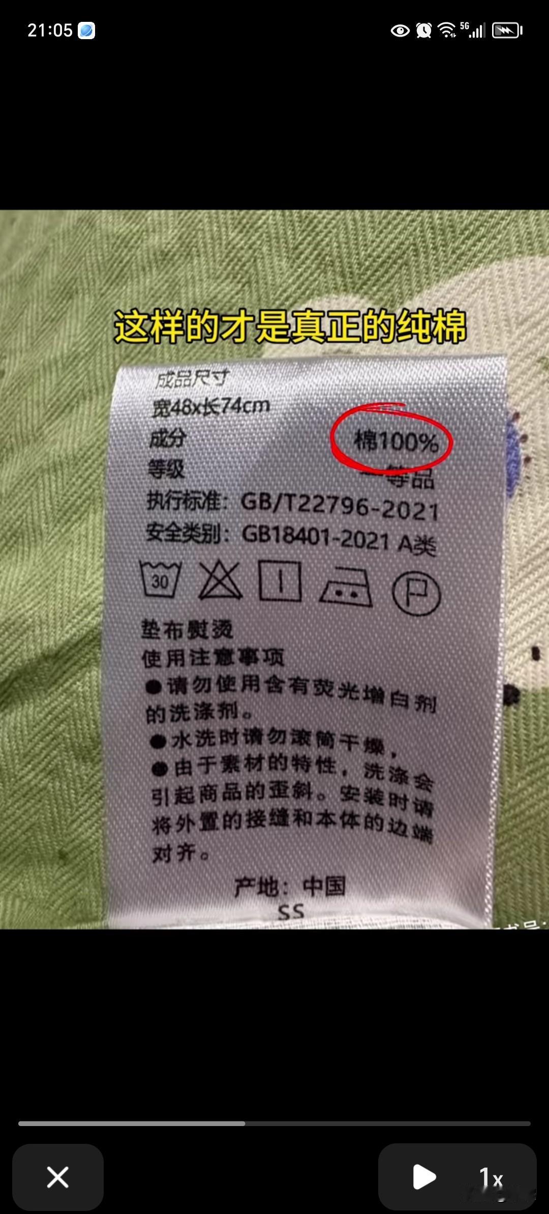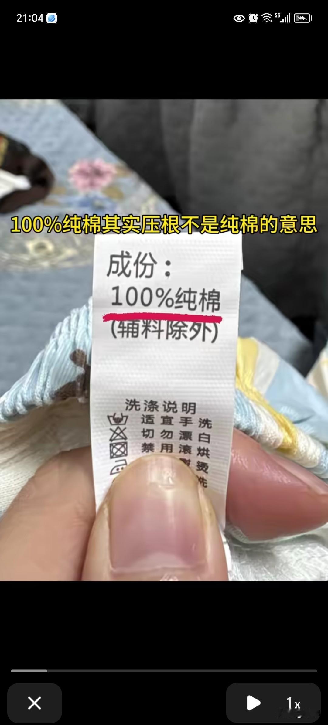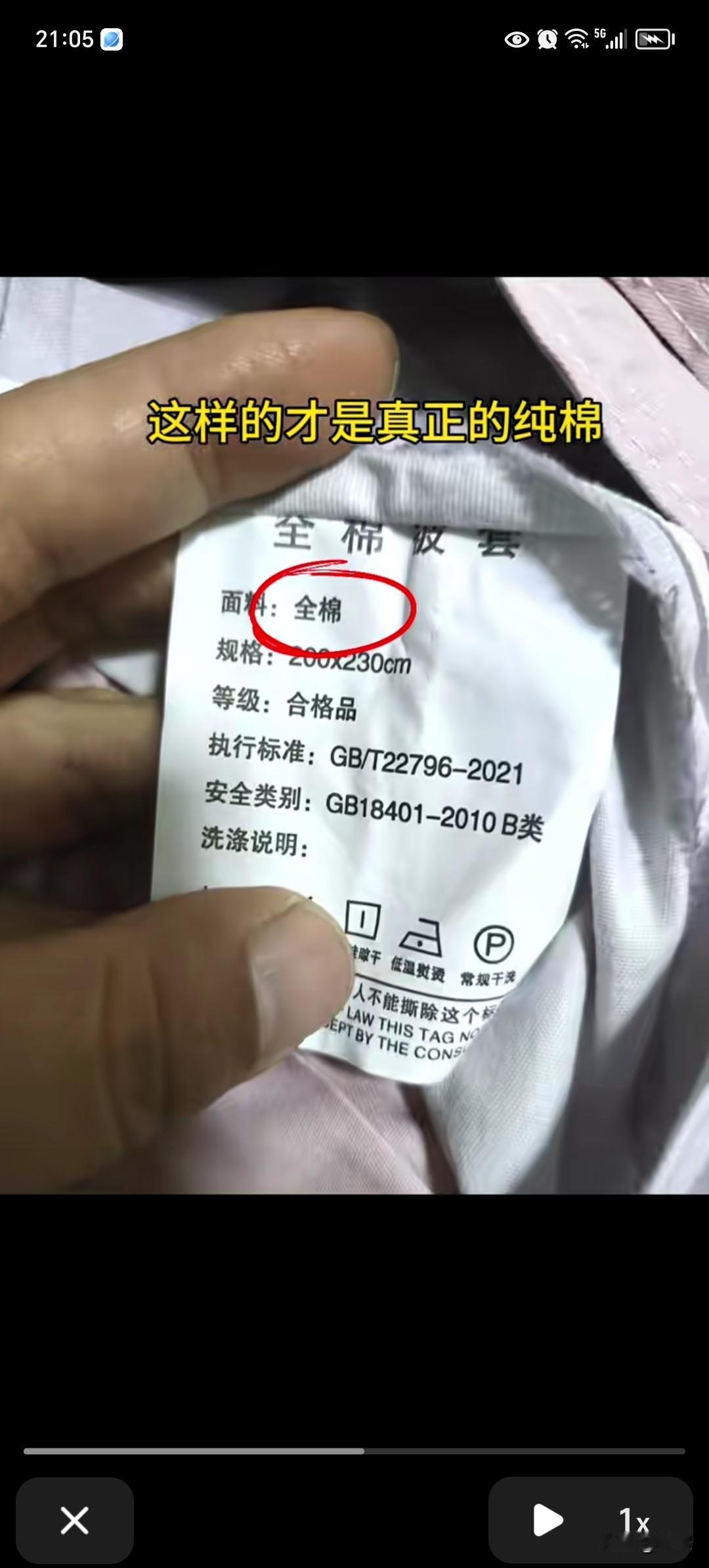 100%纯棉竟然不是纯棉 有时花大价钱买的纯棉短袖,穿两次就起球变形了 “A类母婴级”的纯棉四件套,凑近闻还有一股刺鼻的味道 原来纯棉的东西这么多套路 太多文字游戏,稍一不注意就交了智商税。 写着“100%纯棉”“100%全棉”的都是商家玩的文字套路。 有些“原棉”“木棉皱皱纱”产品,还掺了大量聚酯纤维,甚至是纯化纤材质。 100支的长绒棉,很多是把40支普通棉虚标抬高身价,连A类安全标签都是商家自己贴的。 根据国标GB/T 29862—2013,真正的纯棉只有“棉100%”“纯棉”“全棉”三种合规标注,先看水洗标,认准合规字样;再摸手感,纯棉柔软带涩感,抓握后留明显褶皱。 友友们要擦亮眼睛哦 纯棉 家纺黑心棉 服装质量真相 全棉100棉 假棉四件套 百分百棉面料 水洗棉纯四件套 百分纯棉 全棉百分百棉 百分百棉衬衫 纯棉知识  面料真相 分享今日的感悟 购物 避坑 万能生活指南