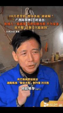 果然不出所料! 木瓶之父被打脸了! 100万悬赏的整体木瓶,居然被广西的 陈师傅给破解了! 湖南株洲刘大叔花三年、砸百万搞出个“整体木瓶”,放话100万悬赏全国高手,还说用德玛吉、马扎克车床两周复刻不出来就得赔他10万。 结果,广西陈师傅直接用6小时就给做出来了! 关键人家还不在乎那100万,就冲“没人能做到”这句话较劲,这格局真不是一般大。 刘大叔这边立马删了悬赏视频,网友都笑称“这脸打得也太猝不及防了”。 其实我特想说,别总把话说太满,这年头高手真的在民间!你以为的“不可能”,说不定在别人那就是“小意思”。 刘大叔这波虽说被打脸,但也算意外起号了,就是不知道下次还敢不敢这么高调悬赏。