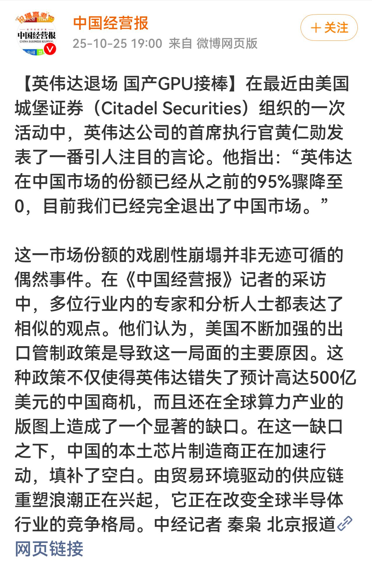 英业达退出中国市场, 如果是6年前,英伟达的撤出会让国内企业措手不及,现在我们不仅能对英伟达反垄断调查,甚至还明里暗里要求大厂跟英伟达脱钩,说明我们已经做了充足的准备。目前能够替代英伟达芯片的国产芯片有很多: 一, 华为昇腾系列:如昇腾910系列,早期产品能对标英伟达A100,新款性能可叫板H100,是H20的四五倍。华为有自己的生态闭环,昇腾芯片搭配鸿蒙系统和盘古大模型,适用于互联网大厂、云计算公司等,2025年一季度华为靠国内市场冲到全球AI芯片市场第三。 二,寒武纪思元系列:寒武纪思元590芯片性能接近英伟达H20,最新的MLU-690芯片,算力能对标英伟达的H100,且兼容性良好,可适配多个大模型,很多大厂都是其客户。 三,海光DCU系列:采用GPGPU架构,兼容“类CUDA”环境,具备全精度计算能力,能发挥大规模并行计算能力。海光拥有CPU+DCU两大产品线,DCU可与CPU共享同一安全域,安全技术水平高。产品广泛应用于大数据处理、人工智能等领域,已占据国内市场头部份额。 四,摩尔线程MTT S4000:基于自研MUSA架构,支持CUDA代码迁移,专注于全功能GPU,覆盖AI计算、图形渲染等领域。其已落地多个智算中心项目,还与字节跳动、腾讯等合作推进AI PC,有较强的生态兼容性。 五,沐曦曦云C系列:属于全栈GPU解决方案中的通用计算芯片,自研指令集和IP,兼容CUDA生态。产品性能国内领先,已交付超2.5万颗GPU,应用于北京、上海等地智算集群。 六,壁仞科技BR100系列:聚焦通用GPU与Chiplet异构架构,算力达英伟达A100的3倍,支持千亿参数模型训练,壁砺模组已落地多个智算中心。 七,景嘉微JM11系列:性能对标英伟达GTX1050,可广泛应用于服务器、工作站、台式机以及笔记本等设备,是国产GPU领域的重要产品,目前最新一代JM11系列图形处理器已完成流片、封装。 客观说,由于芯片制程的限制,我们的芯片在性能上跟人家比还是有差距的,即便我们真有传说中的高端光刻机,产量上一时半会也无法满足市场需求。好在我们已经有了坚实的基础,还有巨大的市场,没什么可担心的。