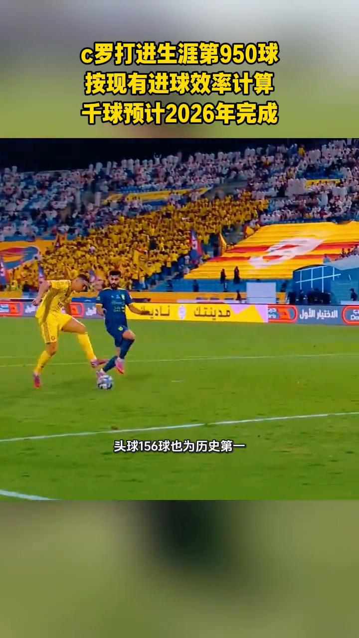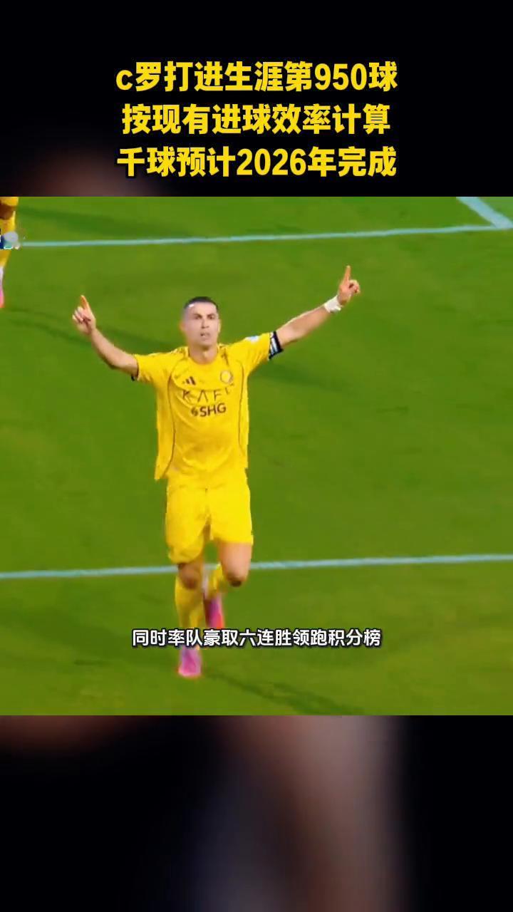 c罗打进生涯第950球,按现有进球效率计算,千球预计2026年完成。 在利雅得胜利对阵哈森姆的比赛中,C罗攻入一球,助球队2比0获胜,斩获个人生涯第950球,同时率队豪取六连胜领跑积分榜。目前c罗领先梅西64球,950球的分布为右脚609球,左脚183球为历史第一,头球156球也为历史第一,点球178粒还是历史第一。 目前c罗距1000球差50球,他和利雅得胜利续约到2027年,按场均0.8球效率推算,有望2026年中达成,我们期待c罗未来的表现。