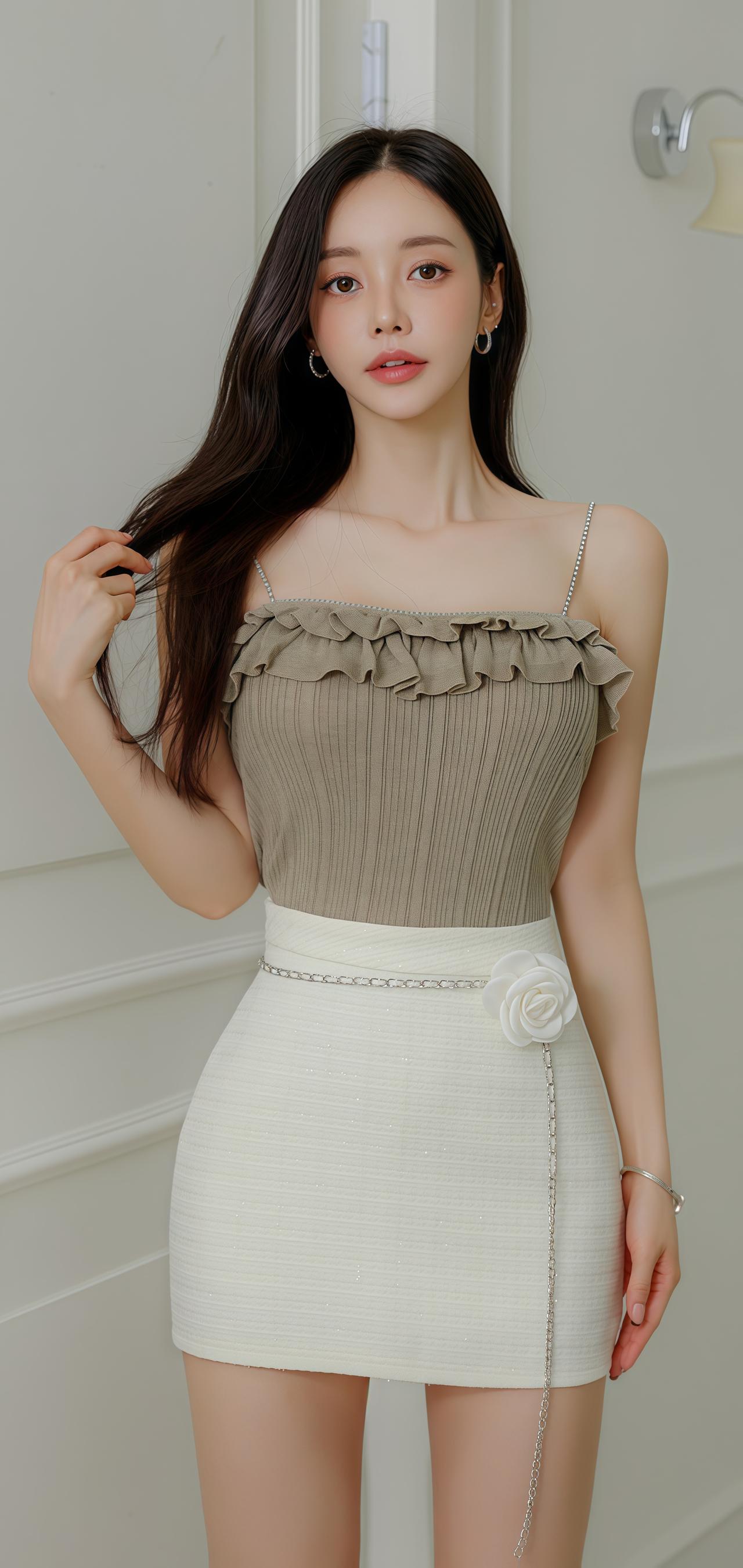 孙允珠韩系温柔气质时尚针织开衫抹胸包臀裙套装图集。