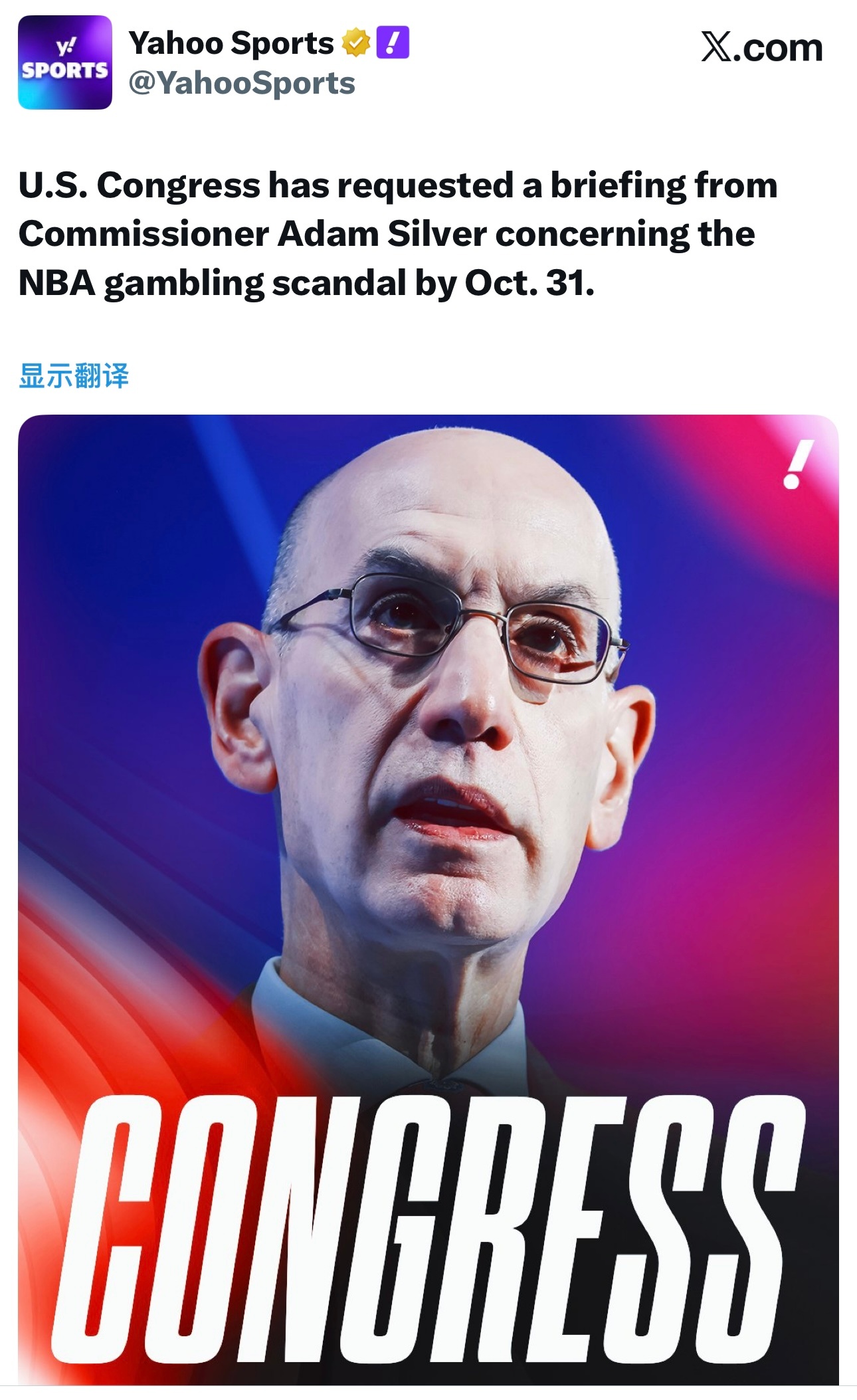 雅虎体育报道:美国国会方面已正式要求NBA总裁亚当-萧华在10月31日前就近期的NBA赌博丑闻进行简报。此次简报要求的背景,是多名教练与球员被指卷入非法博彩与比赛操控案件,包括主帅和热火球员等,他们被联邦起诉涉嫌利用非公开信息下注、操控比赛结果等行为。
