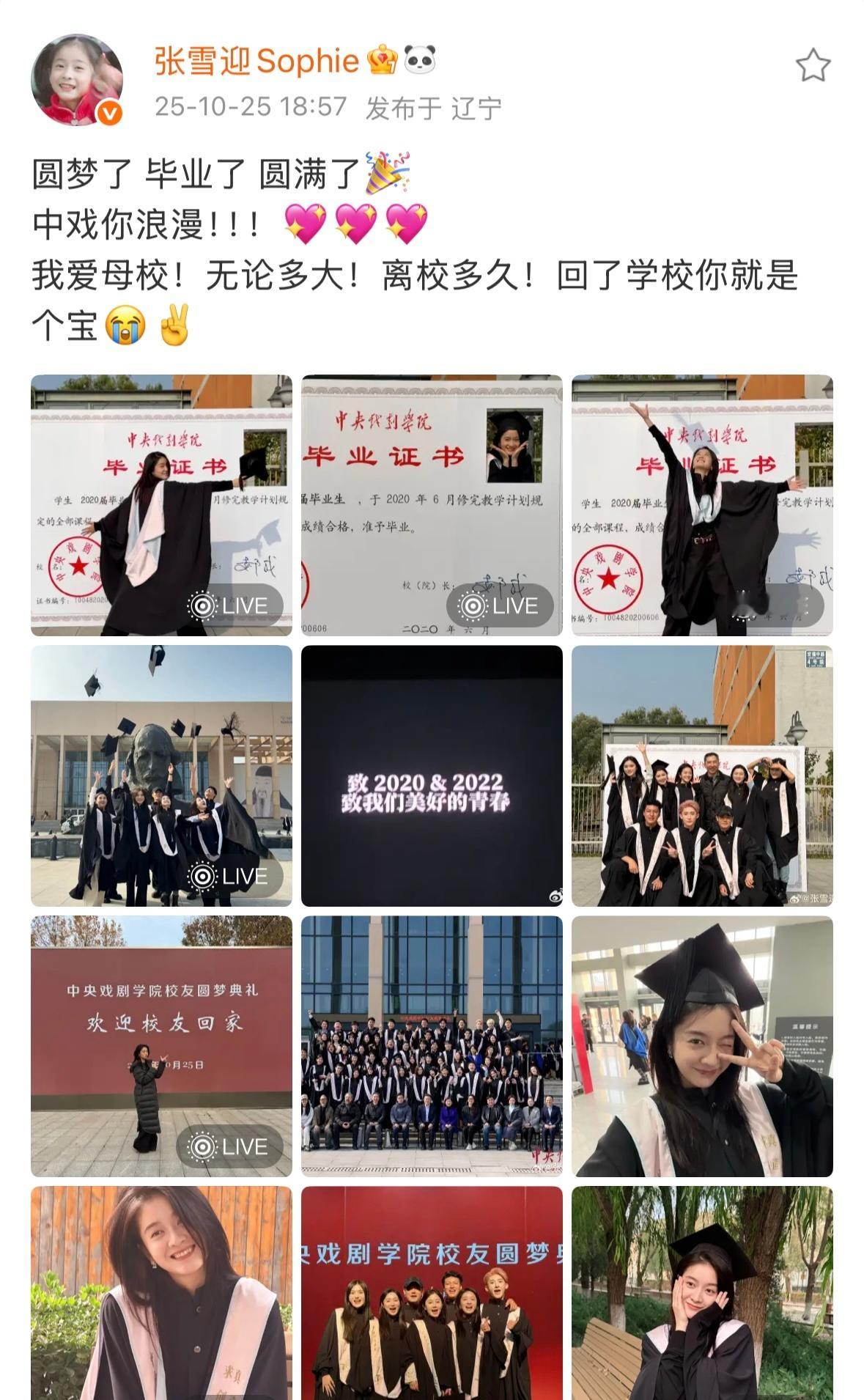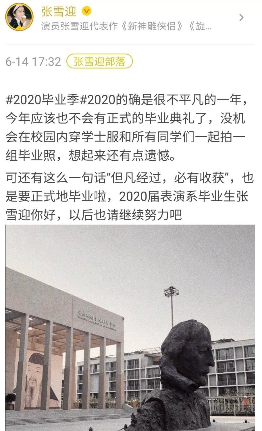 张雪迎回中戏补拍毕业照啦!🎓2016年以中戏第一名的成绩入校,2020年因不可抗力没能拍到毕业照,5年前的遗憾如今终于得到了弥补,恭喜张雪迎,毕业快乐🎊