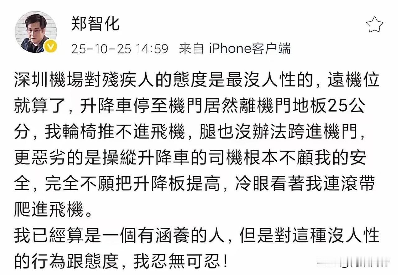 郑智化估计现在后槽牙都要咬碎了! 没想到,机场的工作人员就这么看着自己一个行动不便的人,一步步爬上飞机。本来抬高25公分就够了,但他选择了看着。 25公分的高度,对普通人是抬脚的事儿,对行动不便的郑智化却是道坎。机场明明有升降车,工作人员却眼睁睁看着他一步步往上挪,这场景谁看了不揪心? 有人说这是例外,国内大多公共场合对残障人士挺友好。可我觉得,“例外”才最可怕的,它藏着对弱势群体的漠视,说不定之前还有人默默忍了。开除一个人容易,难的是把“无障碍”真落到实处,不是摆样子的设施,是刻在心里的体谅。 你遇到过公共场合里温暖的无障碍瞬间吗?来评论区说说。