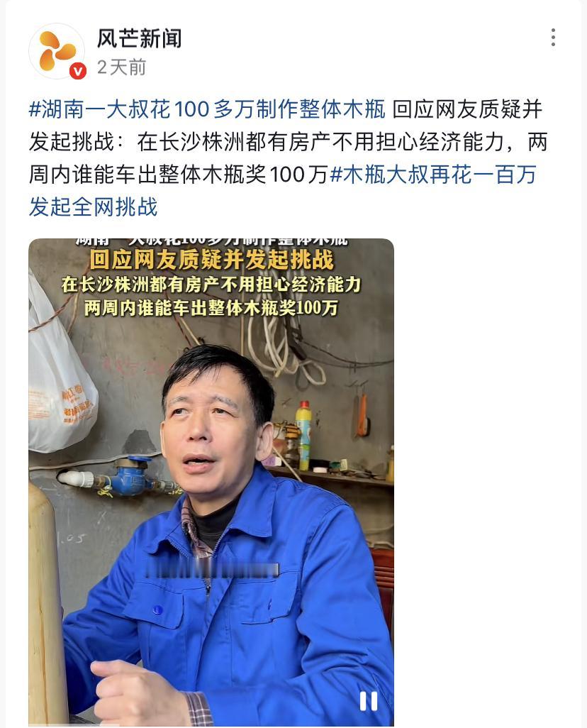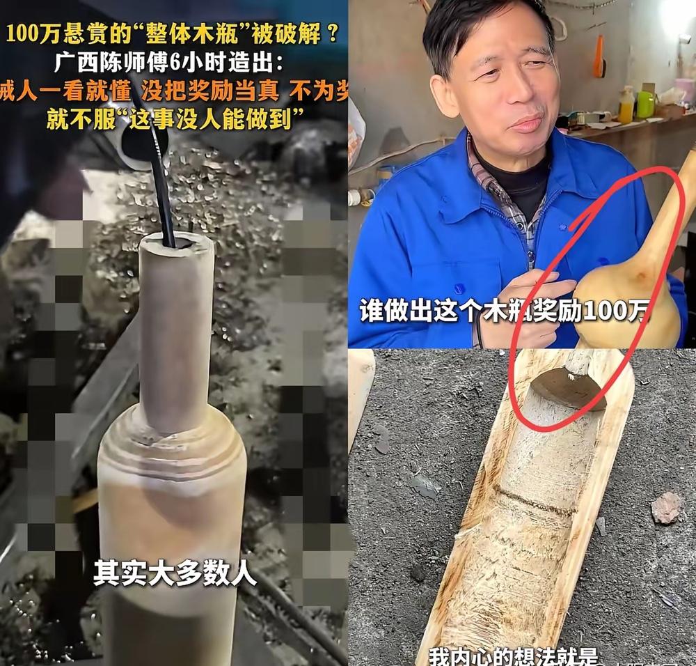 男子悬赏100万元说谁能复刻出木瓶就奖励他100万! 一位小伙仅用6个小时就复刻出来了,这个在绝大多数技工眼里面没有任何技术难度的事情,不知道为什么还要吹嘘,还接受电视台采访。 可能是为了营销卖瓶子,甚至打出了100万元的悬赏,不知道这个人100万元的悬赏会不会兑现。 各位是怎么看的?欢迎评论区留言。