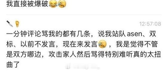 “我直接被爆破,说我站队Asen,攻击我家人骂的特别难听,真的太扭曲了。”