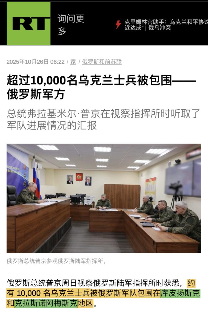 超过10000名乌克兰士兵被俄罗斯军队包围在库皮扬斯克和克拉斯诺阿梅斯克地区。根据克里姆林宫发言人佩斯科夫的说法,两地各有5000人左右被包围。普京周日视察俄罗斯陆军指挥所时祝贺乌克兰军队在库皮扬斯克取得胜利,并下令采取措施,确保被包围的乌克兰军队投降,将人员伤亡降至最低。另外,哈尔科夫附近的沃尔昌斯克也被解放了70%。 RT报道中暂没有提及红军城的战果,但许多消息——无论来自西方、乌克兰还是俄罗斯的消息都显示,俄军已拿下红军城的大部分地区,并且欢迎基辅继续往这个弹坑里扔进更多士兵。 一切都显示出,在俄乌双方苦战四年后,乌克兰到了最终崩溃的时刻。战争进程会被加速,重点观察白俄罗斯方向。