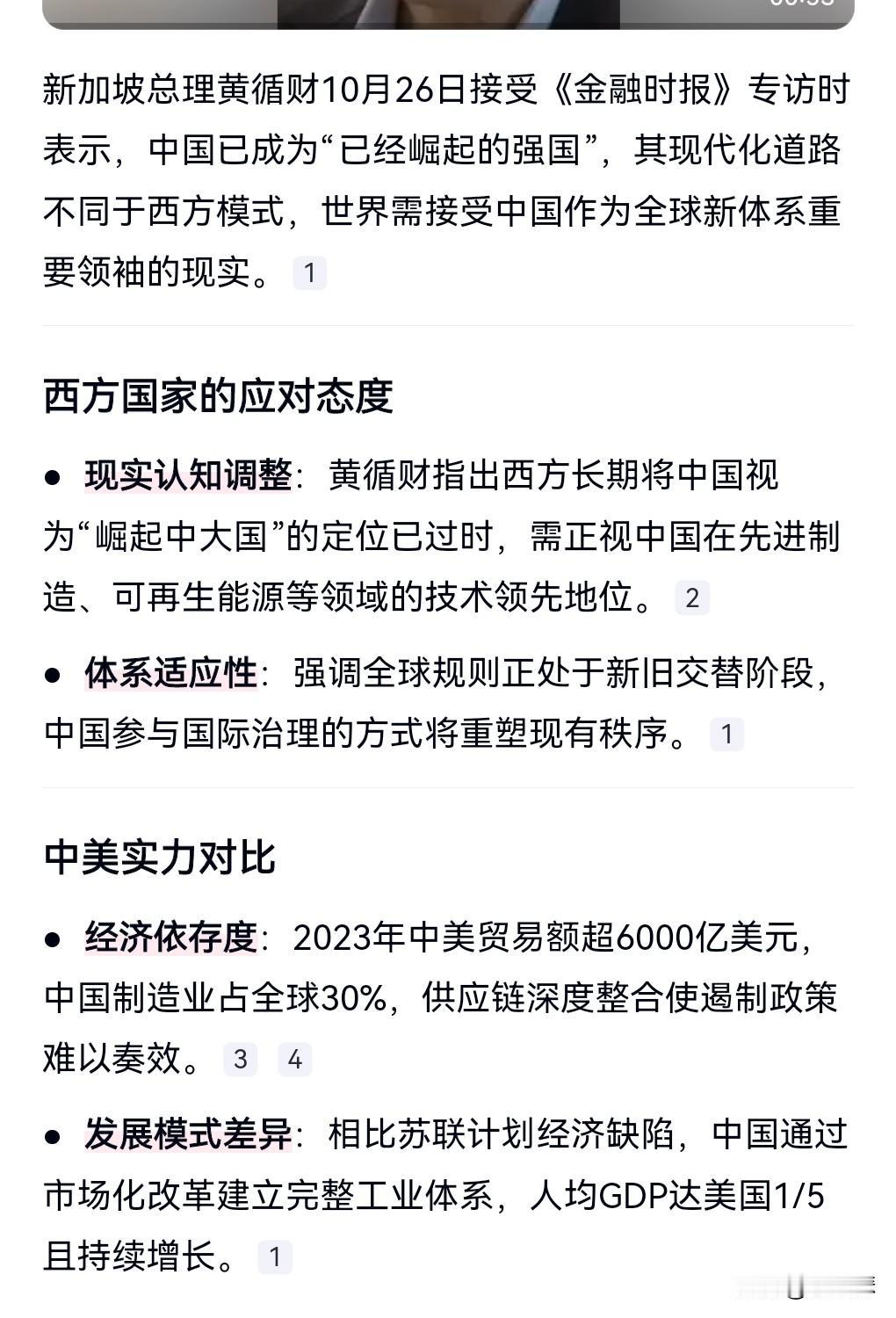 这听着真是让人挺爽的,10月26日,新加坡总理说中国已经是崛起的强国。 事实上也确实如此。中国已经在不少的领域已经领先世界了。 希望中国发展的越来越好。不受西方列强的欺负。 美国无法阻止我们的脚步,对我们的制裁只会让我们越来越创新。 不过我们的人均GDP只有美国的几分之一,这还要努力。