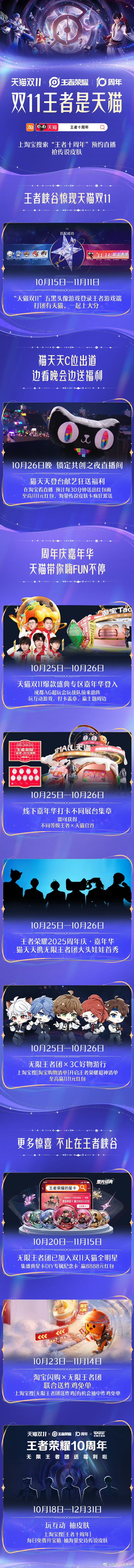 双11王者是天猫天猫联合《王者荣耀》十周年推出“双11王者是天猫”系列活动,整合游戏福利、线下嘉年华、直播红包及3C数码折扣,覆盖线上线下的沉浸式消费体验。