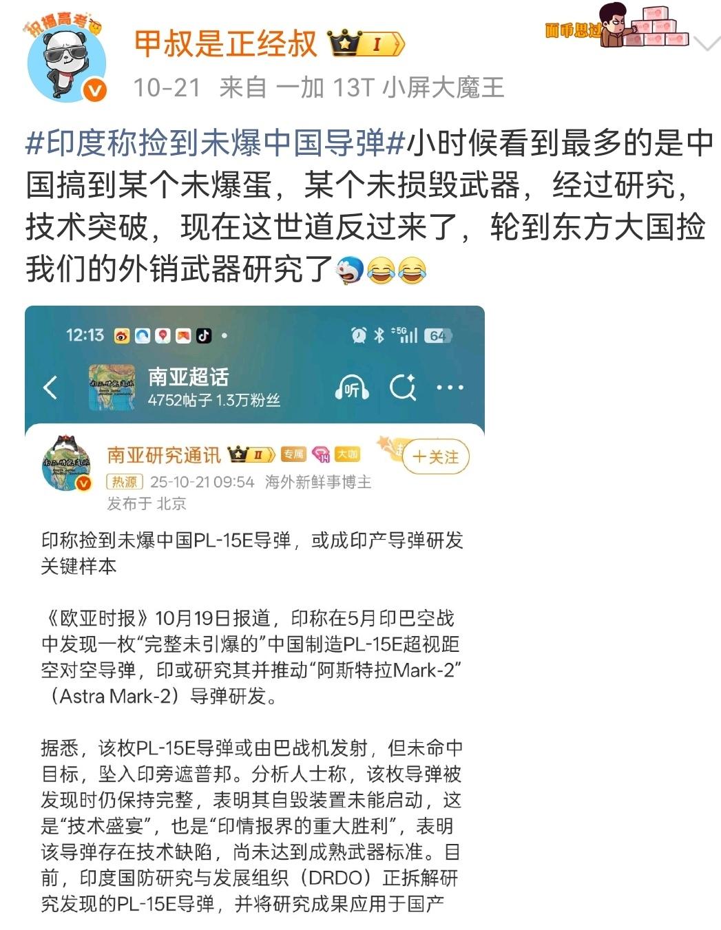 都是大棋局。 (图一)在国内的印度留学生将达到3万名,听说还发放了27万印度人的签证。 (图二)在边境上的墨脱水电站,印军虎视眈眈。 (图三)印巴空战中,印方得到了一个未爆炸,完好无损的空对空导弹,印方宣称,这将有效推动印导弹开发。 这一定是在下大棋局,一般人不会懂的。