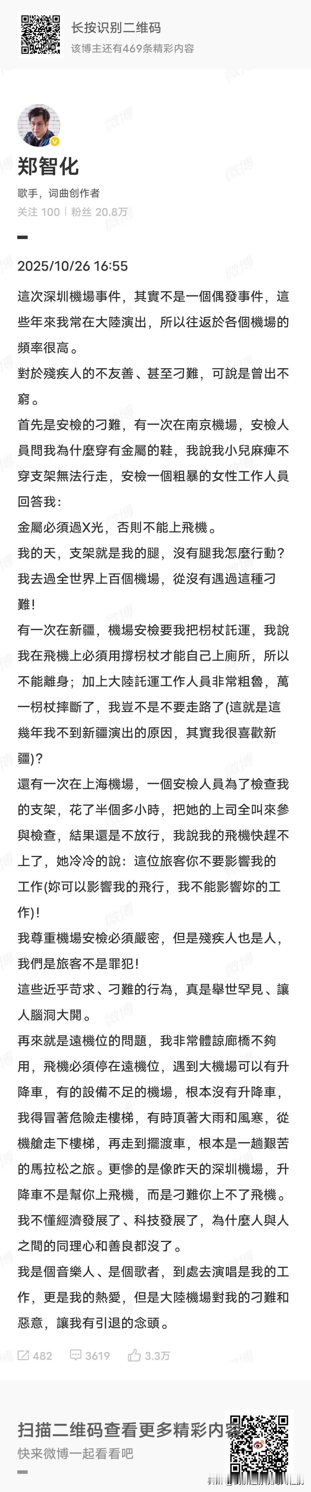郑智化在深圳机场的那点事,真是让人感到无语,不知道这人是何居心。 事发后,他竟然发表声明,说自己受到不公对待,说全国的机场安检都像这样不公对待他! 此话一出,立马引起网友的愤怒,骂声一片!纷纷表示,这就是郑智化的嘴脸吗? 居然想借此抹黑深圳机场,想搞个全国的安检都是这样,以此来为自己开脱,甚至想搞个受害者,想红想疯了吧你!说实话,第一次看到这么不要脸的人! 居然受尽了磨难,还是一副穷途末路,弃妻而逃的德行,真的是太让人失望了。现在有这么多喜欢他的歌的人,真的应该看清他的真面目,不要再支持他了。 支持他隐退的决定!