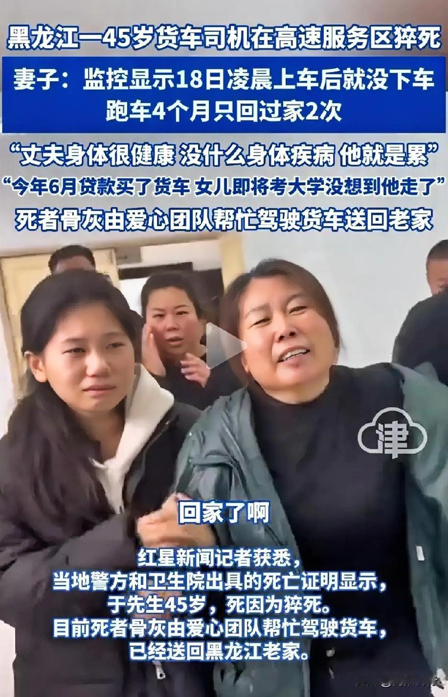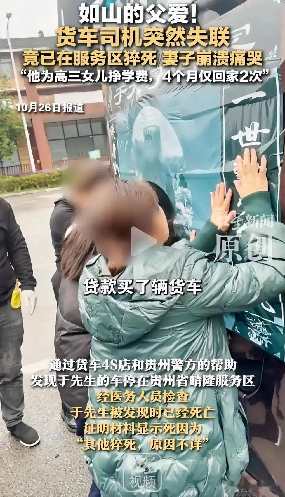 45岁货车司机余大哥在贵州服务区猝死。 “我知道他累,但没办法啊!”贵州服务区,谭女士的哭声扎心了。她45岁的老公,跑货车的余大哥,为了高三的女儿,为了贷款买的车,4个月只回了2次家。 最后一单拉水果,晚上10点出发,凌晨1点在服务区休息,睡前还打了电话。可早上9点联系不上,人就没了。有人说请两个司机,可现在运费价,请人就亏;夫妻一起跑,孩子又没人管。 这哪是一个余大哥,这是千万个扛着家的普通人。他们的累不是矫情,是不敢停的命。 我觉得,善待他们不是一句空话,是路上多让一步,是运费别再压价。你们说,怎么才能让这些“顶梁柱”能喘口气?