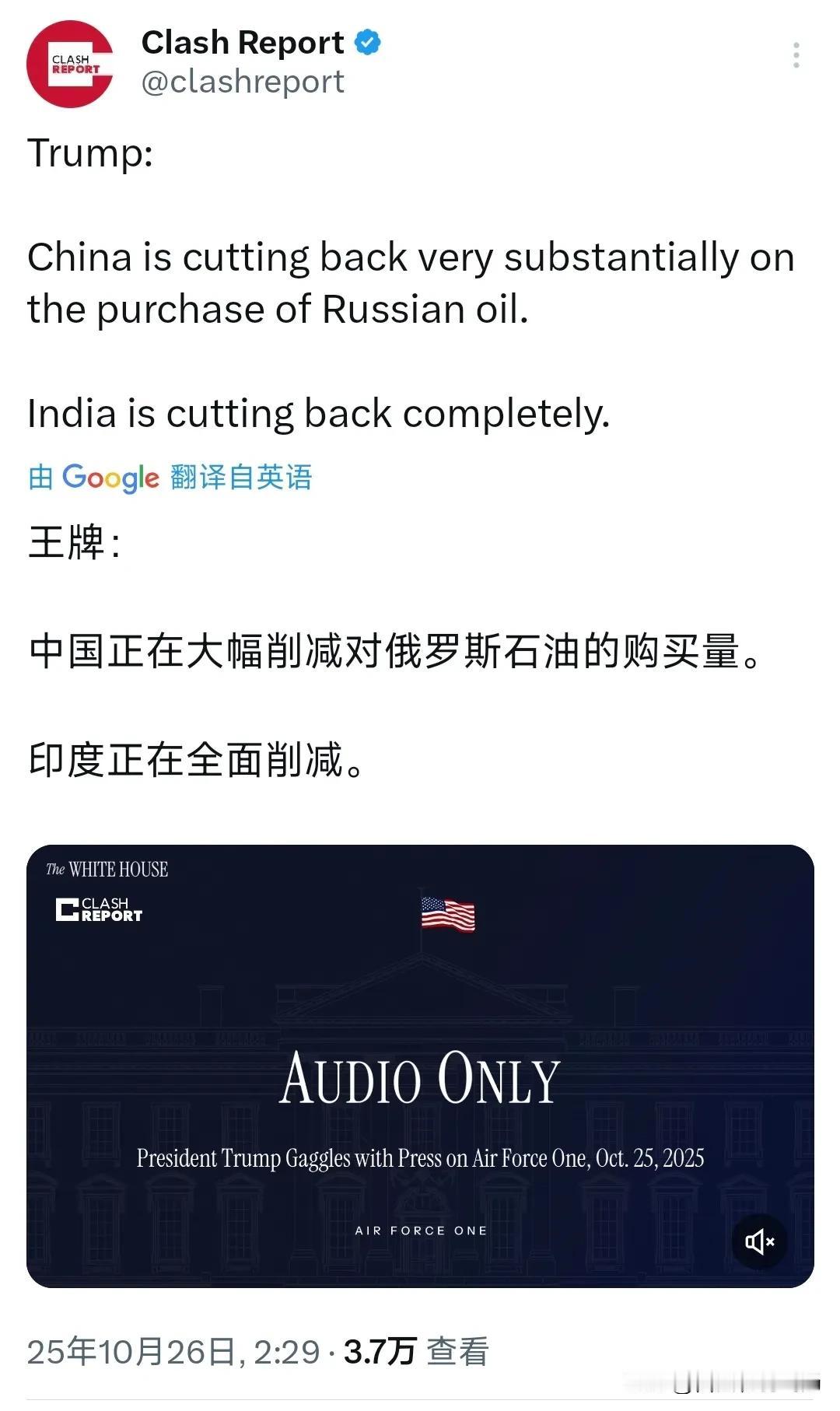 特朗普今天(北京时间10月26日)表示:“中国正在大幅削减对俄罗斯石油的购买量。