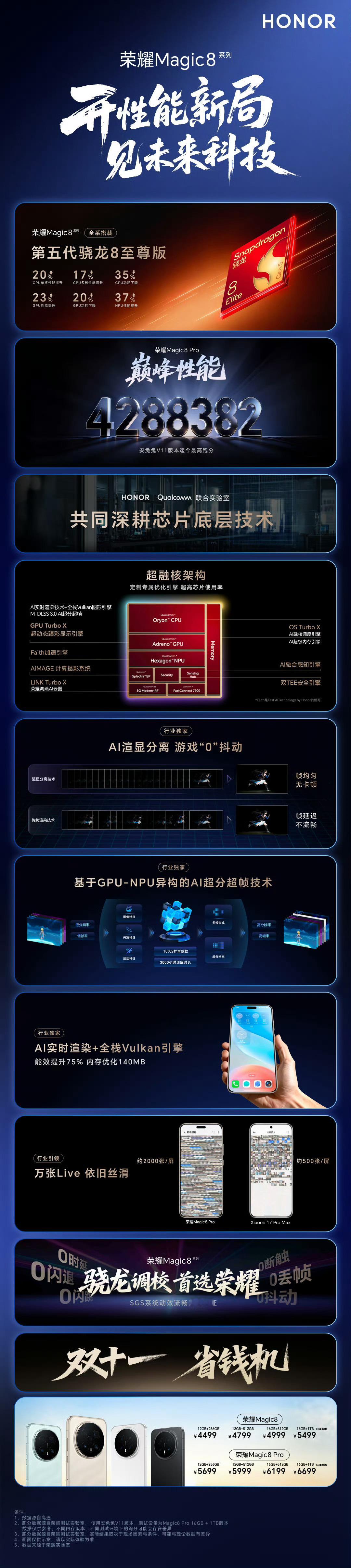 荣耀Magic8系列全系搭载第五代骁龙8至尊版芯片,采用台积电3nm工艺,安兔兔跑分突破428万,性能表现堪称安卓阵营新纪录。