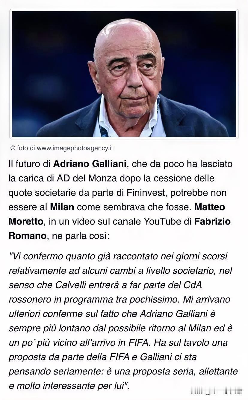 加利亚尼回归米兰的可能性越来越低!莫雷托消息我可以确认告知米兰球迷,卡尔维利将很快加入米兰董事会,另外所有球迷都期待的加利亚尼回归米兰问题,加利亚尼重返AC米兰的可能性越来越小,而加入国际足联的可能性却越来越近。上周消息说国际足联对加利亚尼做出了诸多承诺,他们期待加利亚尼能为国际足联发展做出贡献。 国际足联已经向他发出了邀请和报价,加利亚尼正在认真考虑:对他来说,这是一个认真、诱人且非常有趣的报价。据说加利亚尼对于回归米兰心存疑虑,米兰对于加利亚尼的职能描述过于模糊,并没有明确加利亚尼到底在米兰具体工作是什么。 个人不愿意加利亚尼去国际足联,米兰在意甲无论是与意大利足协还是裁判委员会都需要加利亚尼这样的人物来操作,他去了国际足联,未来我纯只要比赛有啥不顺利,就是又被迫害了。