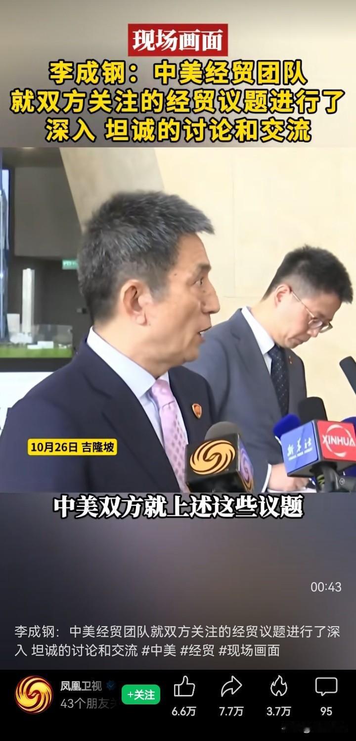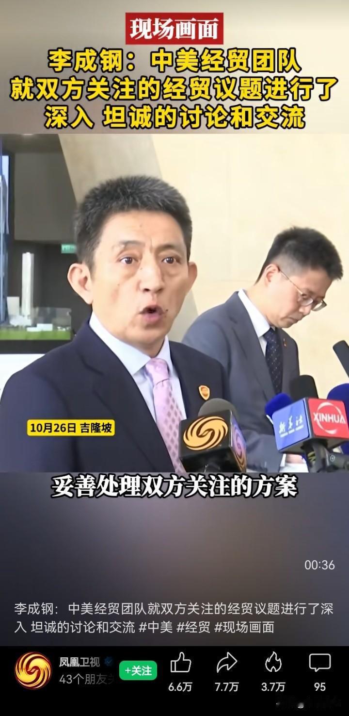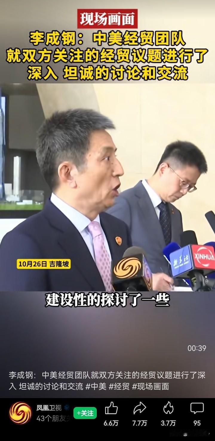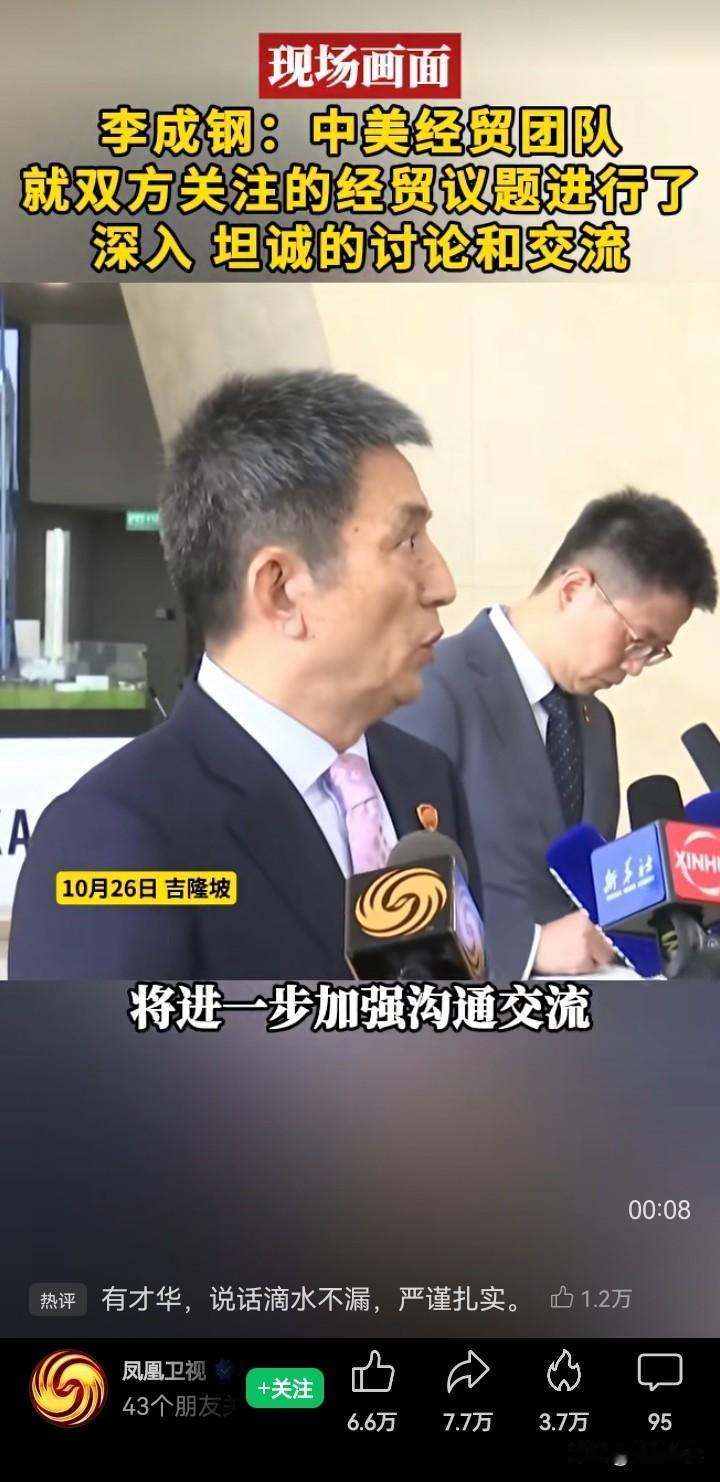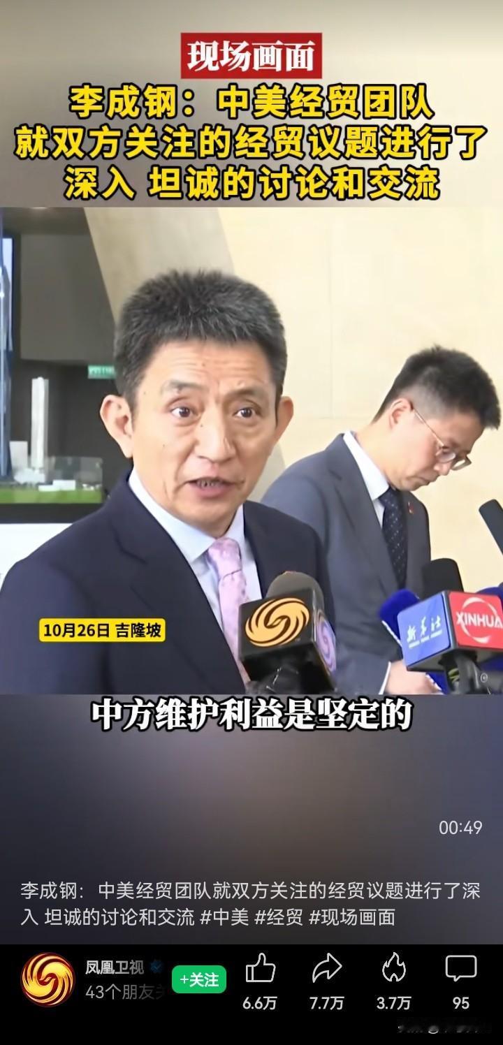 这就是大国外交的自信!“美方表达立场是强硬的,中方维护利益是坚定的”。 看了李成钢先生对于经贸谈判的一小段讲话,深有感慨。“深入、坦诚的讨论和交流”,也就是在谈判桌上,我们也毫不畏惧地阐述了我们的要求,虽然美方意图想借着所谓的实力来进行强硬施压,但是,我们是不会吃这一套的,对于自己的利益,必须坚决维护。 经贸,说白了就是做生意,讲究公平自愿,搞强买强卖是行不通的。这是地球人都明白的道理,希望美方也要设法明白这个道理,以让中美经贸得到更稳定、更健康的发展!