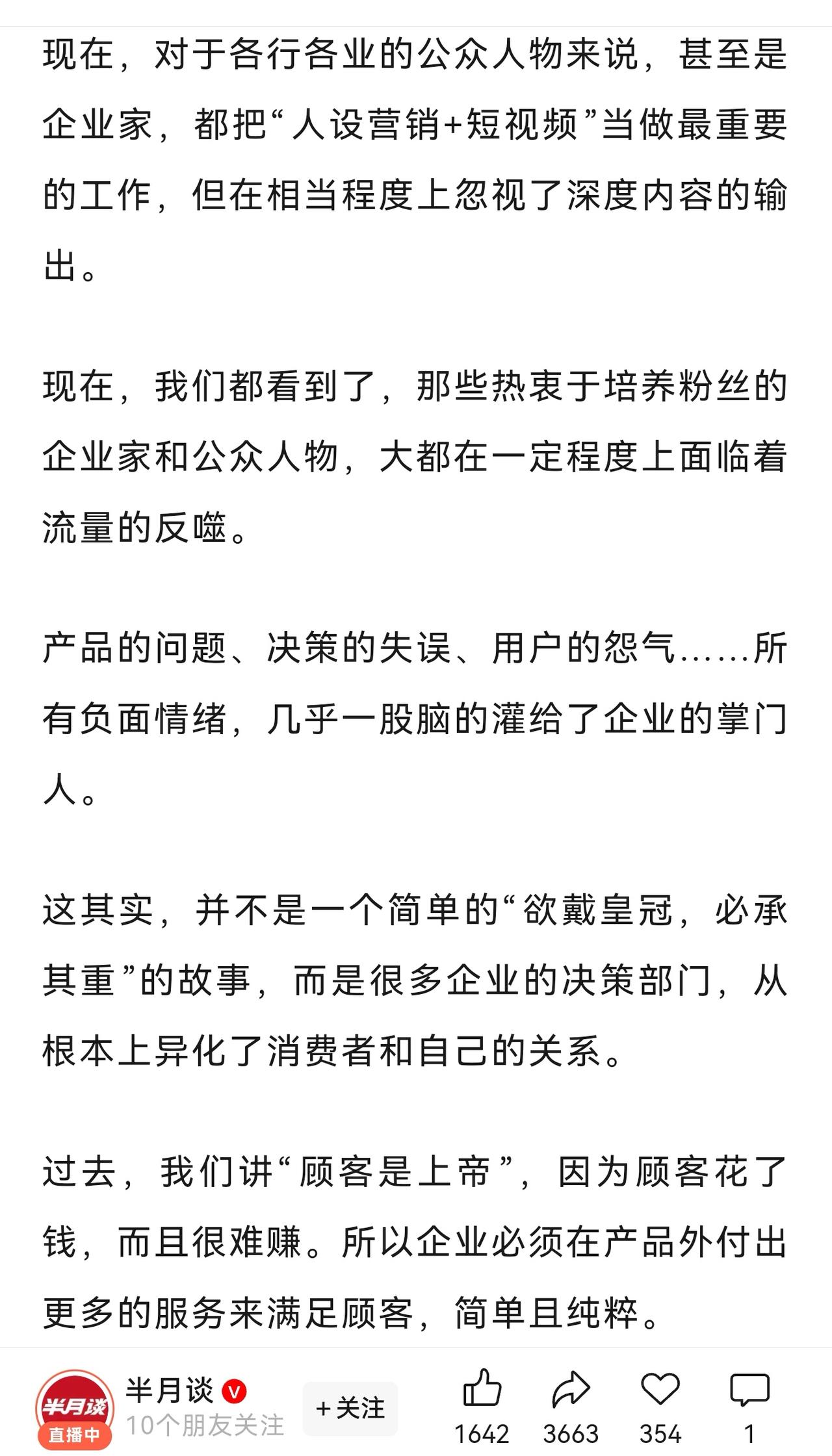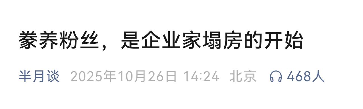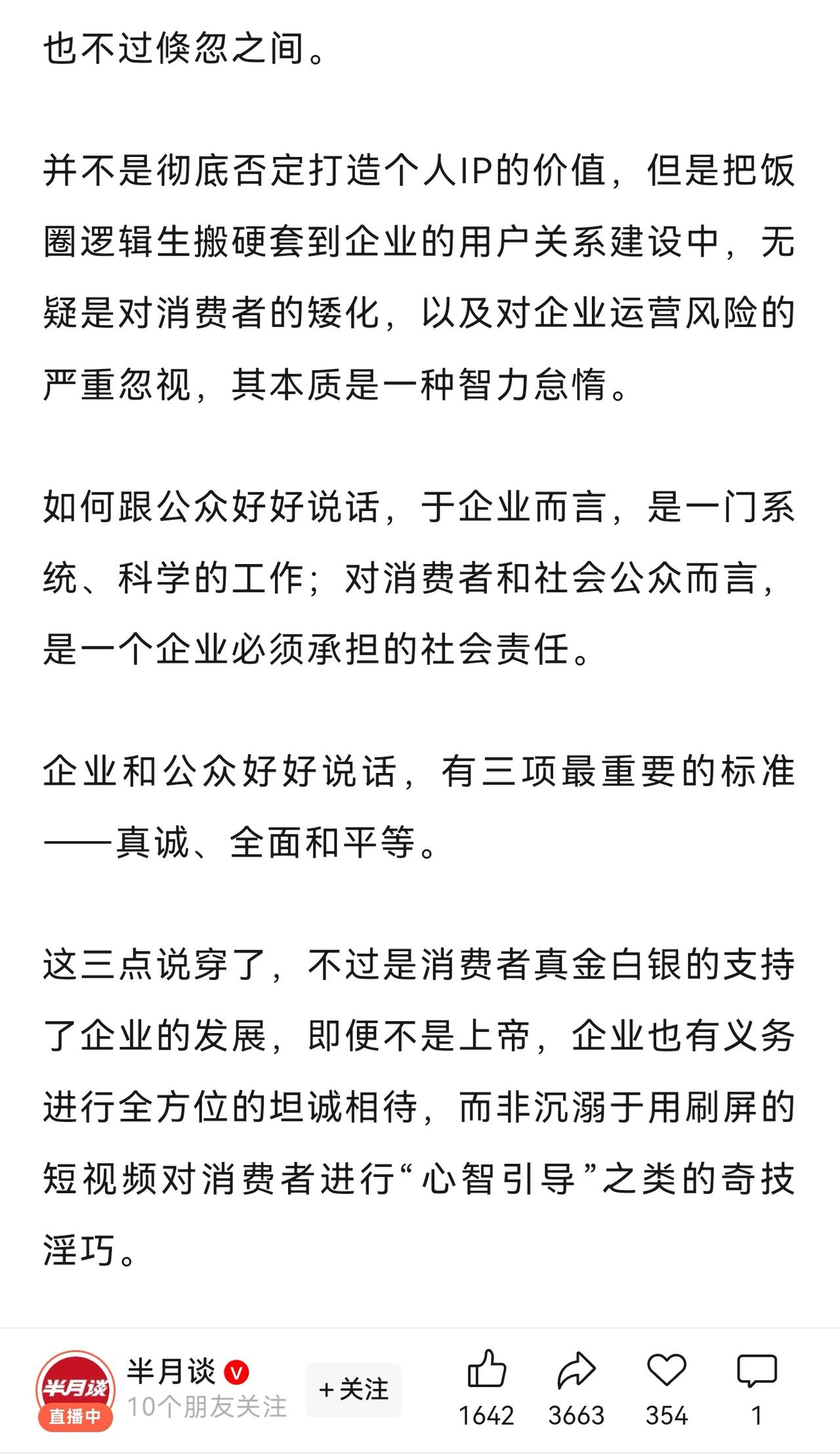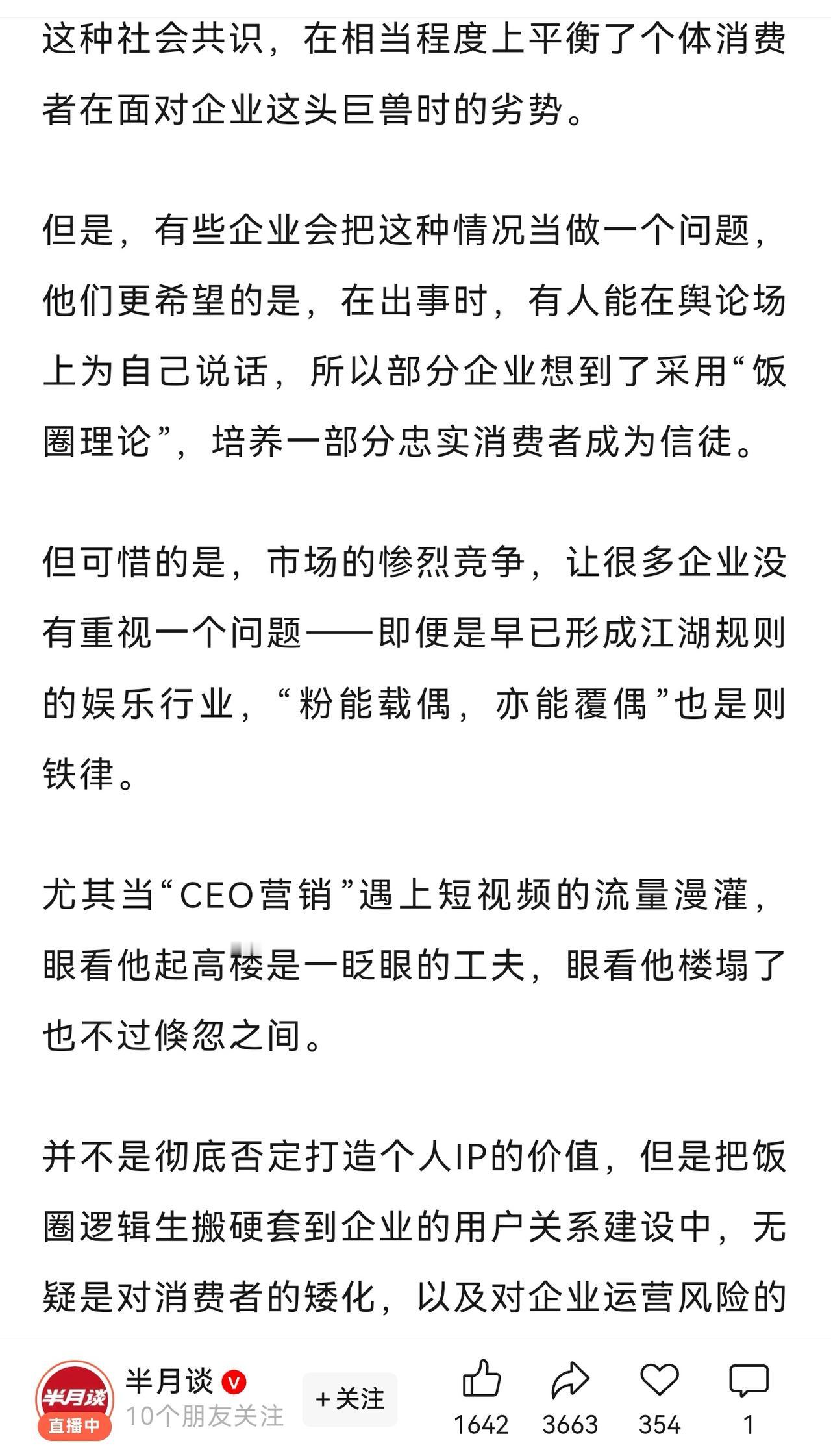 《半月谈》指出:豢养粉丝,是企业家塌房的开始。博主愿用毕生所学解读一下这篇评论,不得不佩服官媒对问题研究之透彻,用词之深刻,警示之雷霆,纠偏之正义。 “甚至是企业家”“企业的掌门人”“CEO营销”精准定位处于负面舆论中心的企业创始人。 “产品的问题、决策的失误、用户的怨气…所有的负面情绪几乎一股脑灌给企业的掌门人”是对企业自身有问题才导致用户有不满情绪表达的深刻洞察,官媒并不支持所谓的“有黑公关”“我被黑了”这种推诿式辩解。 “异化了消费者和自己的关系”“个体消费者面对企业这头巨兽的劣势”是为消费者正名:不论企业掌门人表现的多么委屈、多么君子、人设多么完美,都比消费者强势得多,是占了便宜还卖“惨”。 豢养“饭圈”“信徒”“粉丝”是对“消费者的矮化”“企业经营风险的严重忽视”“本质上是智力怠惰”,揭示到根上了,精彩! 最后给出企业和公众好好说话的三个标准“真诚、全面、平等”,批评教育后还给出解药,请问这次服气了吗?赶紧改正!