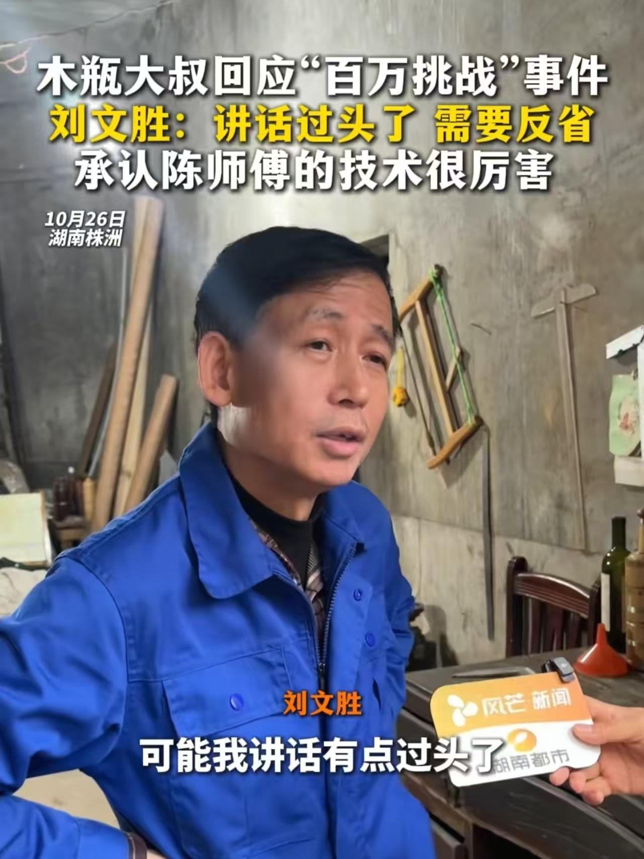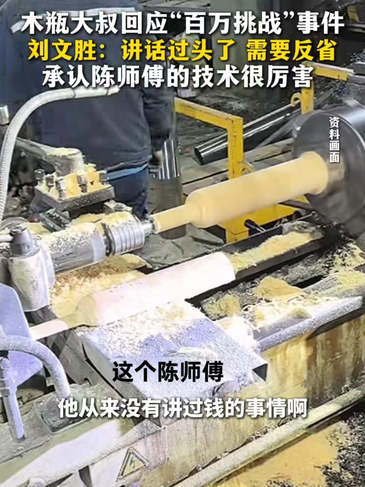 木瓶哥今天下午出面回应了!对于100万的悬赏,是有前提条件的,必须要用德玛吉或者马扎克这种机床做出来才算数。因为陈师傅用的是普通机床,而且还是在自己发布视频4天后才做出来的,所以奖励不算数。 木瓶哥说到,他已经联系过广西的陈师傅了,对他的技术表示十分的认可。他还说到,人家陈师傅自始至终都没有讲过钱的事情。自己当初夸下的海口,现在竟然一点也不敢承认了。 对于当初自己的目光短浅,他用一句“我说话有点过头了”草草地应付了事。不得不说,木瓶哥的嘴是真的硬啊。 陈师傅不计较,但是又有人看不下去了,一位名叫“红叶”的网友正在使用德玛吉机床来制作这种整体木瓶,而且已经做出来了,大家都想老登这次该死心了吧。 但是令大家没想到的是,木瓶哥又变卦了,不车瓶子了,改车葫芦了。 网友直言:“现在最难的不在于车什么了,最难的是让木瓶哥拿出这100万”!