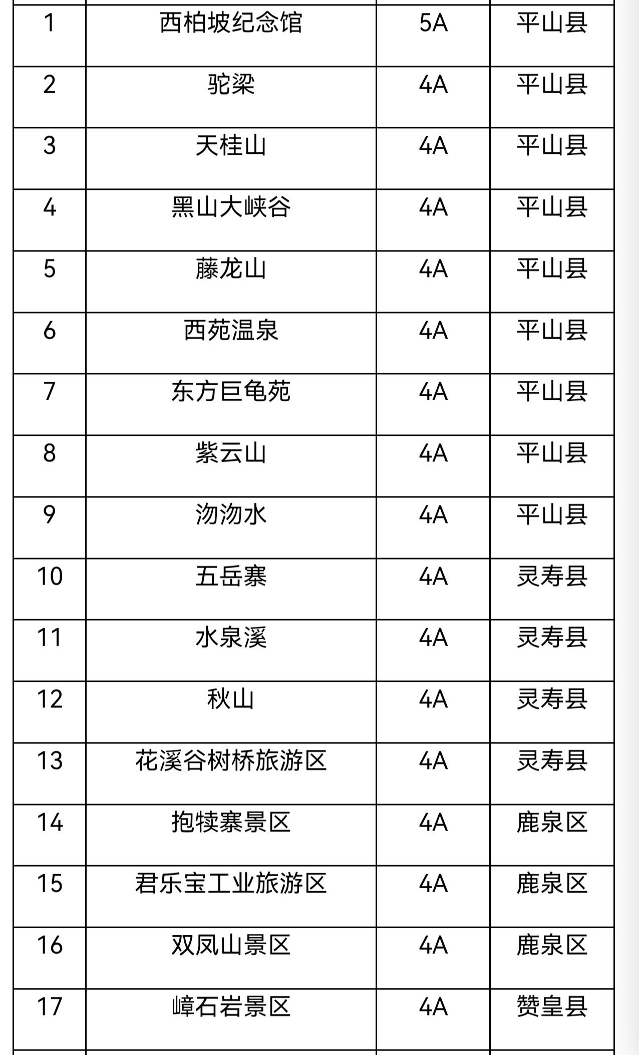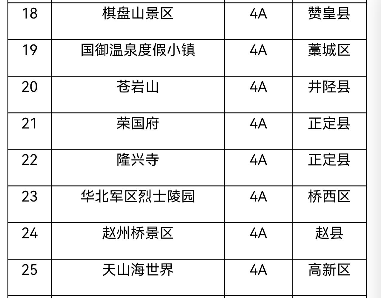 河北省地级市:石家庄 5A和4A景区详见图片 补充4A景区: 1、西山森林公园 2、漫山花溪谷 3、东寺渔村 4、佛光山 总计1个5A景区,28家4A景区