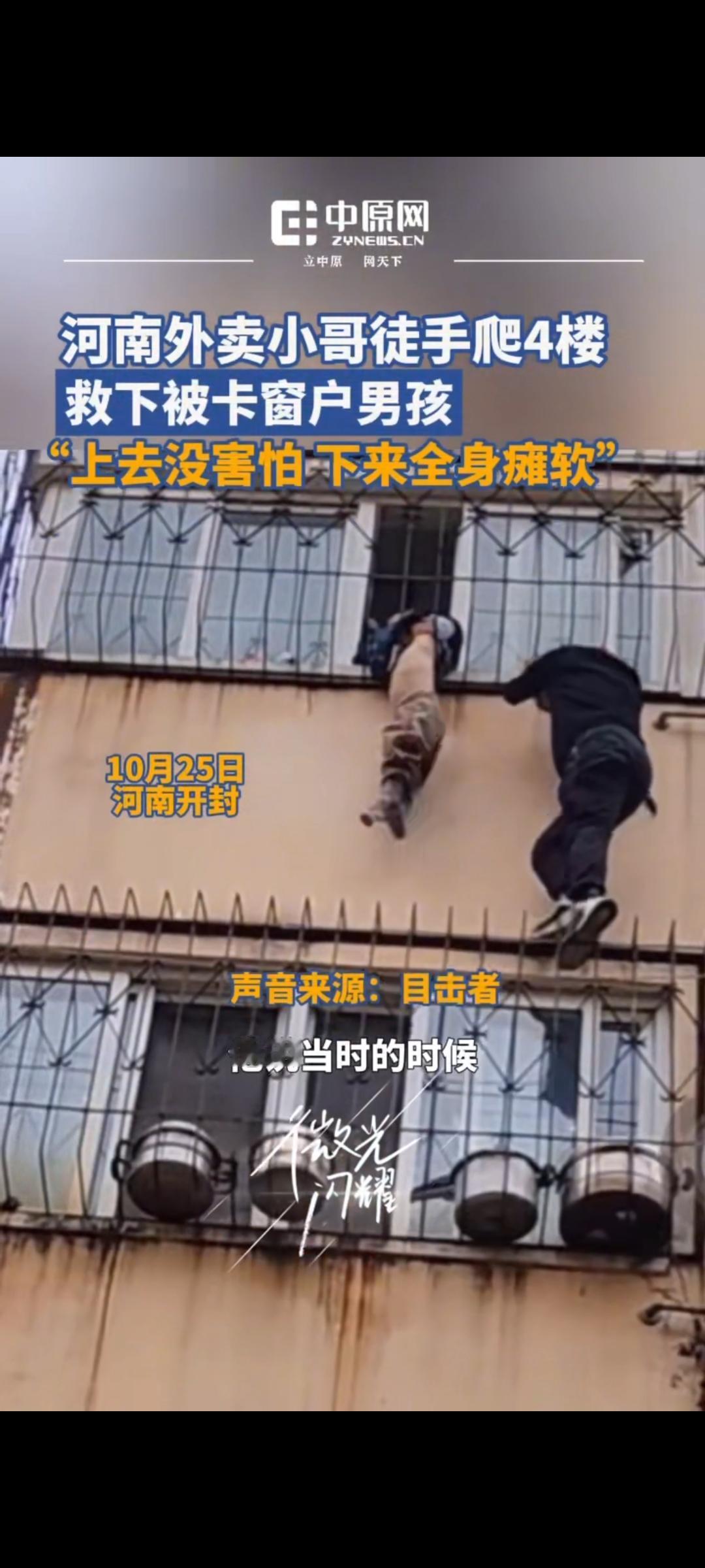 徒手爬四楼,救下命悬一线的孩子。 2025年10月25日中午,河南省开封市龙亭区大宏世纪新城小区。 一名男童在家中玩耍时,不慎跌落至4楼窗户外,头部和衣物卡在防盗窗栏杆缝隙间,身体悬空、双腿乱蹬,情况十分危急。孩子的妈妈在窗内拼命拉住孩子双臂,但体力逐渐不支,随时可能发生坠落。 38岁的京东外卖全职骑手崔玉龙,刚送完单准备离开小区时,听到呼救声立即赶来。他观察到防盗窗结构后,毫不犹豫徒手攀爬,从一楼沿着防盗网艰难爬至三楼位置,抵达孩子身边。 起初尝试直接托举孩子未果,崔玉龙随即调整姿势,将左腿支起作为支撑点,让孩子踩着他的腿,与屋内的妈妈合力将孩子安全送回屋内。整个救援过程约15分钟。