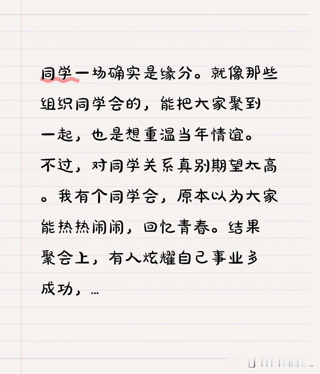同学一场确实是缘分。就像那些组织同学会的,能把大家聚到一起,也是想重温当年情谊。不过,对同学关系真别期望太高。 我有个同学会,原本以为大家能热热闹闹,回忆青春。结果聚会上,有人炫耀自己事业多成功,有人抱怨生活不如意,完全没了学生时代的单纯。 其实,同学间有事情互相走动,互相帮衬,没事情各自过好自己的生活,这样就挺好。不用强求每个人都和上学时一样亲密,保持淡淡的联系,偶尔回忆下过去的美好,也是一种珍贵的体验。