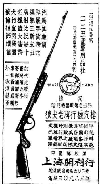 狼犬老牌行猎汽枪是德国哈门(Hartmann)机器厂的产品,在民国二十六年(1937)左右由上海开利行担任总代理,并由位于上海的二二五童军用品社经售。该广告宣称此枪款样式玲珑、构造坚固,且风行于欧美各国,是当时猎枪界的顶级产品。该广告中,每支特价为国币十五元。 现代的Hartmann公司主要生产工业产品和零部件、医疗用品或通风设备等。