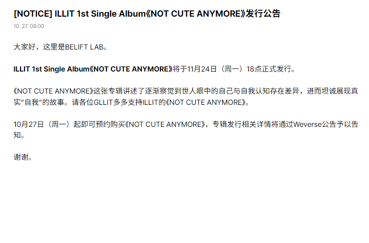 ILLIT将于11月24日发行单曲专辑《NOT CUTE ANYMORE》