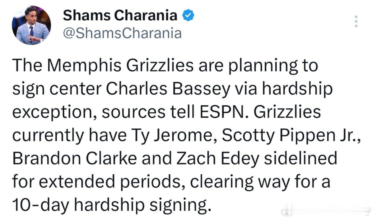 目前,灰熊队杰罗姆、小皮蓬、克拉克和扎克·伊迪都会长期缺阵,球队不得不通过10天合同的伤病特例签下中锋。