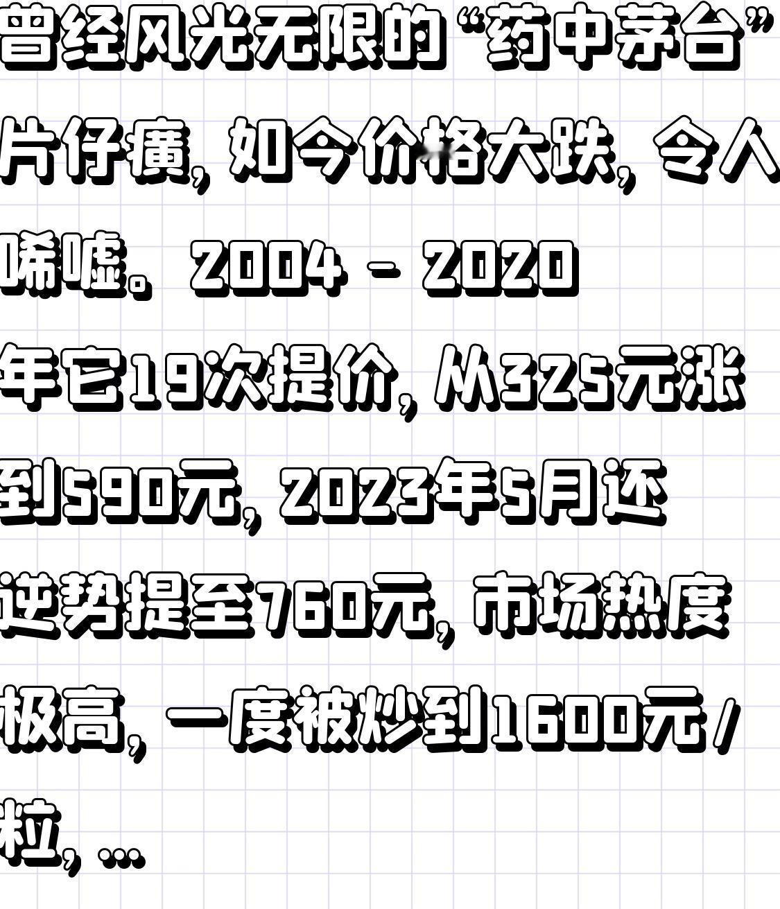 曾经风光无限的“药中茅台”片仔癀,如今价格大跌,令人唏嘘。2004 - 2020年它19次提价,从325元涨到590元,2023年5月还逆势提至760元,市场热度极高,一度被炒到1600元/粒,多地一粒难求,电商旗舰店也常缺货。 但从去年起,形势急转直下。二手回收市场价格不断下跌,回收商称行情饱和、市面上货太多。今年10月23日,济南某药店片仔癀锭剂销量不乐观,价格下跌,“一个月也卖不了几粒”。看来,炒作起来的高价终究难以长久。