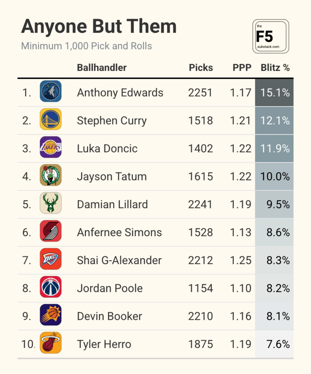 被针对程度:对手用包夹防他挡拆的比例12.1%(排名第2),仅低于爱德华兹,说明库里的挡拆破坏力强,对手不得不频繁用包夹来限制库里。