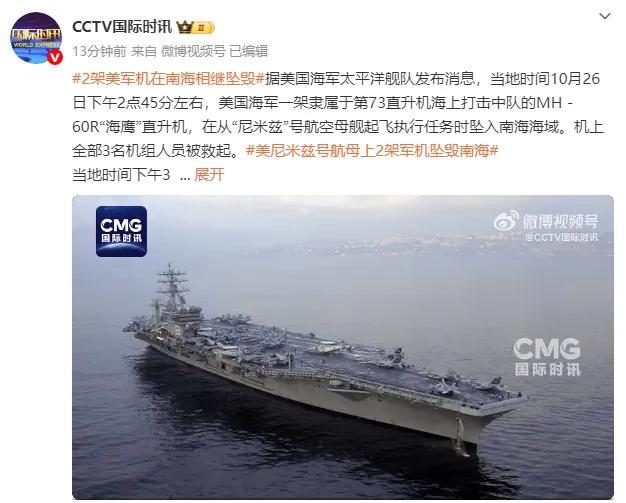 当地时间10月26日,美国海军可真是“流年不利”。先是下午2点45分左右,一架MH - 60R“海鹰”直升机从“尼米兹”号航母起飞执行任务时坠入南海,好在机上3名机组人员被救起。紧接着到了下午3点15分,一架F/A - 18F“超级大黄蜂”战斗机也从“尼米兹”号起飞后坠毁,2名机组人员弹射逃生也被救了回来。 “尼米兹”号今年3月就开始部署,到现在已经7个月,估计这是它退役前最后一次任务了。这两架军机相继坠毁,原因还在调查中。只能说,美国在南海搞这些小动作,说不定就是“常在河边走,哪有不湿鞋”。