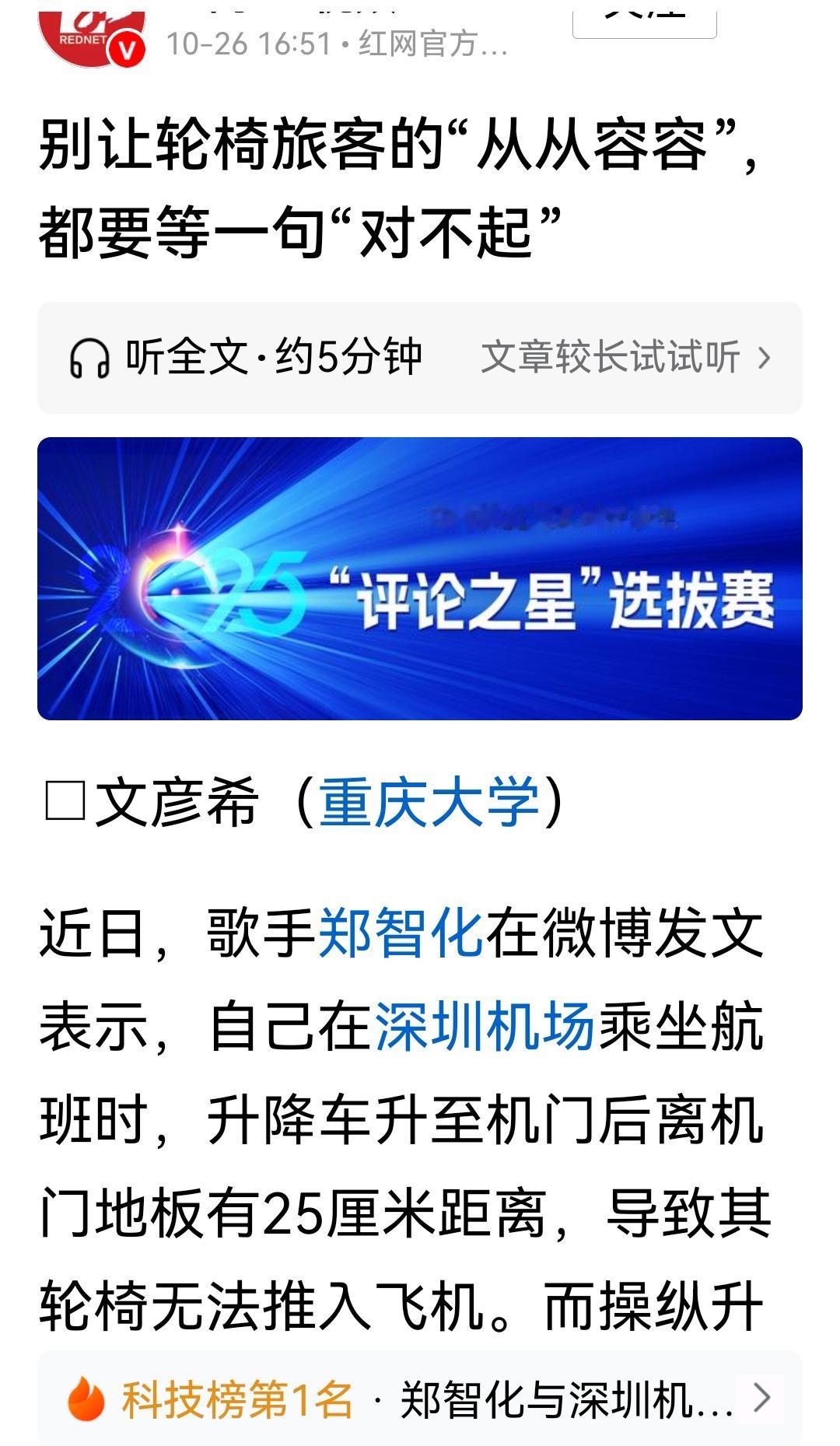 这篇文章的意思是飞机的安全不重要? 在航空器安全与残疾人无障碍通行便利,两者只能选一的前提下,必然优先考虑航空器安全。 无障碍通行不便利完全可以通过其他方式来解决,深圳航空做到了。 如果为了残疾人为了自己无障碍通行便利而忽视航空器的安全,将全体乘客置于危险之中,是非常自私的行为吧?