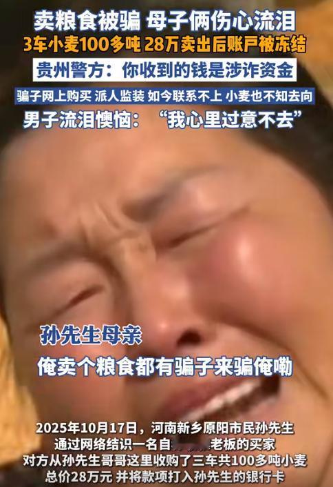 “太难了!”近日报道,河南新乡,男子卖了3大车,共计104吨小麦,发完货,便很快收到了28万元货款。可令男子万万没想到的是,钱还没捂热,银行账户就被警方冻结。因为警方告诉其收到的钱属于涉诈资金,有可能需要原路退回,如今其又联系不到买家,小麦也不知去向,彻底懵了,急得崩溃大哭!   “那可是100多吨粮食啊,说没就没了!”老孙一家是普普通通的庄稼人,守着几百亩地,过着春种秋收的日子。今年小麦收成不错,通过一个粮食购销的微信群,他们联系上了一位“大买家”。对方说话爽快,没怎么讨价还价就定下了三车、足足104吨小麦。   装车那天,买家派了人来现场监装,整个过程十分顺利。看着满载小麦的大卡车一辆接一辆开走,老孙觉得一年到头的辛苦,总算没有白费。更让他惊喜的是,发货后没多久,手机就收到了28万货款到账的银行短信提示。   “这回可算是遇上爽快人了!”老孙兴奋地给哥哥打电话报喜,很快就把部分钱款转给了妻子和哥哥,计划着这笔钱该怎么用:还贷款、买化肥、给孩子交学费……   谁知仅仅两天后,老孙就发现银行卡怎么都操作不了。他急忙赶到银行柜台,工作人员查询后告诉他:“您的账户被警方依法冻结了。”   “冻结?”老孙懵了,他这辈子都没遇到过这种事。更让他慌张的是,很快哥哥和妻子的账户也相继被冻结。一家人这才知道,这笔钱涉嫌是诈骗资金。   原来,给他们打款的所谓“买家”,很可能是一个诈骗团伙。这些人先骗取受害者的钱财,然后寻找像老孙这样进行大宗农产品交易的卖家。诈骗分子将赃款作为货款打给老孙,拉走实实在在的100多吨小麦,完成了“赃款洗白”的过程。等到受害者报警,警方顺藤摸瓜,自然就冻结了老孙一家收到赃款的账户。   “我们是正经卖粮的啊!”老孙的妻子哭着说,“粮食被拉走了,现在钱也没了,我们找谁说理去?”   老孙尝试联系当初的那个“大买家”,却发现对方的电话已经打不通,微信也被拉黑。那100多吨小麦,早已不知去向。   “那是我们一年的心血啊。”老孙的哥哥红着眼眶说,“我们兄弟俩种这些地,投进去了全部家当,现在还欠着银行十几万的贷款。”   他们咨询了律师,得知按照相关法律规定,如果能够证明他们是善意的卖家,确实交付了货物,且对款项来源不知情,理论上可以向警方申请解冻。但这个过程需要时间,需要证据,需要法律程序。   这起事件在当地的农民圈里也引起了不小的震动。很多粮食经纪人都表示,以后交易要更加小心。“现在骗子的手段真是防不胜防。”一位资深经纪人说,“以后大额交易,最好等多确认几次款项来源再发货。”   老孙更想不明白,自己老老实实种地,规规矩矩做生意,怎么就摊上了这样的事?   其实,在这个电信诈骗层出不穷的时代,老孙一家的遭遇并非个例。越来越多的诈骗分子正在把手伸向农村,伸向那些淳朴老实的农民。他们利用农民信息相对闭塞、法律意识相对淡薄,设计出了各种新型骗局。   如今,老孙一家还在等待着警方的最终处理结果。他们盼望着能够早日解冻账户,拿回属于自己的血汗钱。但即便钱拿回来了,这次经历给他们带来的心理阴影,恐怕需要很长时间才能抚平。但愿老孙一家的遭遇能够引起更多人的重视,也但愿这样的悲剧不再重演。   信源: 极目新闻——河南农户100多吨小麦卖28万,收款后资金因涉诈被冻结,辛苦钱能要回吗?律师解读   文│一阳 编辑│史叔