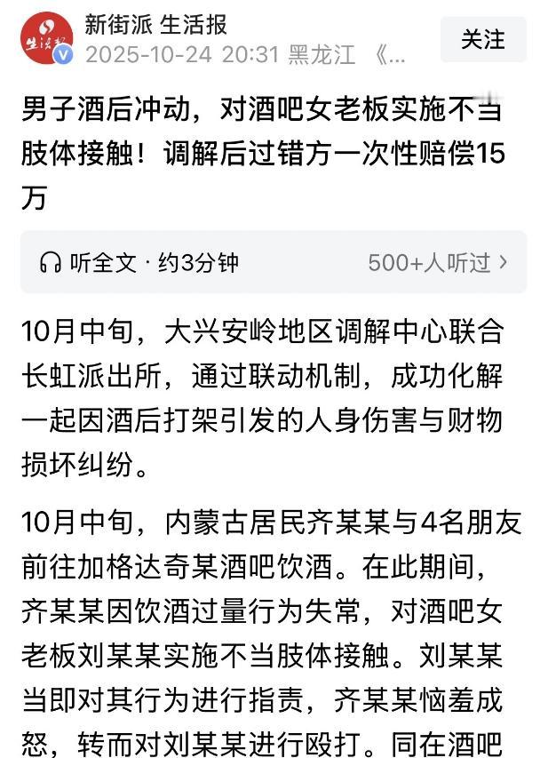 内蒙古一男子和朋友去酒吧玩,喝多之后,发现旁边有个美女,为了在朋友面前露一手,竟然走过去对女子动手动脚,没想到,遭到女子大声呵斥,周围人全都看过来,男子觉得丢了面子,借着酒劲,一拳将女子打翻,2名男顾客路见不平拔刀相助,男子的朋友以为他被欺负,也加入战团!女子选择了报警,结局令人极度舒适。 内蒙古大兴安岭加格达奇的一家酒吧,半夜里音乐正闹,齐某某跟四个朋友围坐一桌,啤酒瓶摆了半圈,个个喝得脸红脖子粗。 他眼睛扫到吧台边的女老板刘某某,借着酒劲拍着桌子吹嘘,说要去“认识一下”,想在朋友面前耍耍威风。 脚步踉跄着凑过去,齐某某伸手就往刘某某身上搭,刘某某当即躲开,厉声骂他耍流氓,周围客人全停了动作,目光齐刷刷聚过来。 齐某某酒劲上头,觉得脸被丢尽,抬手一拳砸在刘某某脸上,人当场倒在地上。 “住手!”两个声音同时响起,邻桌的顾某某和吕某某猛地站起,冲过来一把推开齐某某,顾某某扶刘某某起身,吕某某挡在前面呵斥。 齐某某的四个朋友见状,以为兄弟被欺负,抄起板凳就冲过来,啤酒瓶砸碎的脆响、桌椅倒地的闷响混在一起,三个人很快被围在中间,身上都挨了打。 刘某某爬起来摸出手机报警,声音带着哭腔却很坚定,酒吧老板急得直跺脚,想拉架又怕被误伤,只能护着其他客人往角落躲,混乱中吧台上的洋酒摔碎好几瓶,木质桌椅断了腿,地面溅满酒水和玻璃碴。 警察来得快,亮灯一照,闹事的几个立刻停了手,齐某某还想撒酒疯,被民警一把按在墙上,酒意瞬间醒了大半。 医护人员随后赶到,给刘某某三人处理伤口,顾某某胳膊被划出血,吕某某额头肿了个包。 起初几个人还嘴硬,直到调解员拿出监控录像,画面里他们动手的样子清清楚楚,这才低下头没话说。 另一边,调解员也劝刘某某三人,合法诉求能通过调解快速解决,不用耗在官司上。 等双方情绪平了,面对面坐下来,齐某某几人当场鞠躬道歉,声音小得像蚊子叫,最终敲定赔偿十五万,包括医疗费、误工费和酒吧的损失,签字时手都在抖。 这事看得人解气,本想耍横显能耐,结果既赔了钱又丢了脸,顾某某和吕某某的出手相助,更是让人觉得暖心——这世上还是公道人多。 酒壮不了怂人胆,反而容易让人犯浑,真闹到违法的地步,再后悔也没用,就像民警说的,遇事冷静点,比啥都强。