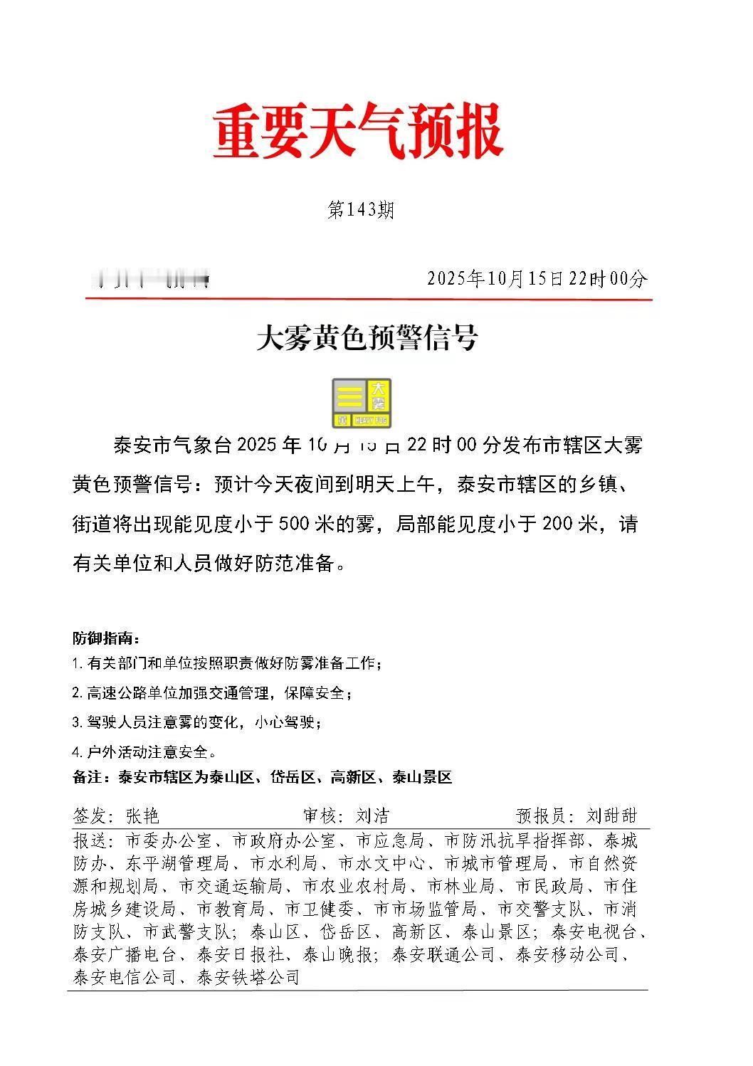 市辖区大雾黄色预警。泰安市气象台2025年10月26日21时10分发布市辖区大雾黄色预警信号:预计今天夜间到明天早晨,泰安市辖区的乡镇、街道将出现能见度小于500米的雾,局部能见度小于200米,请有关单位和人员做好防范准备。备注:泰安市辖区为泰山区、岱岳区、高新区、泰山景区